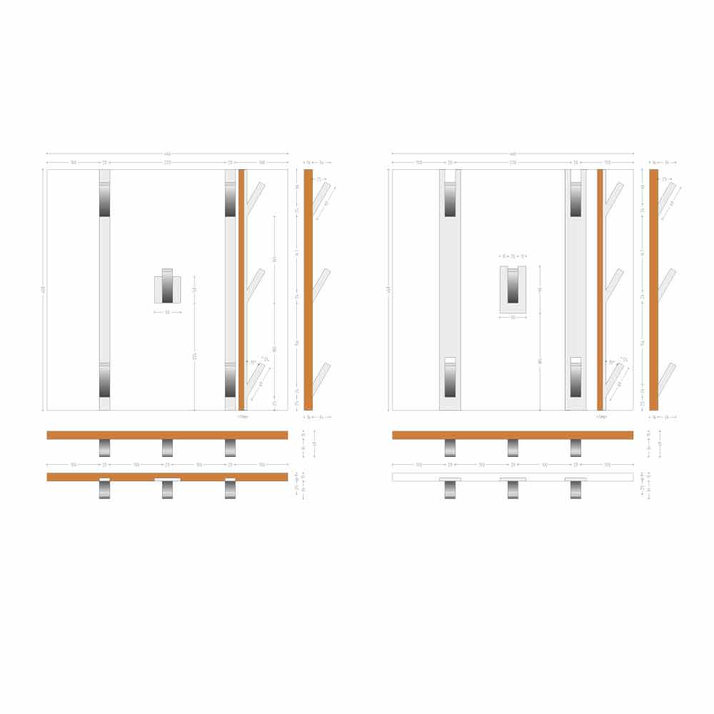 teakhouten wandpaneel met 5 witte corian hangers vormt een