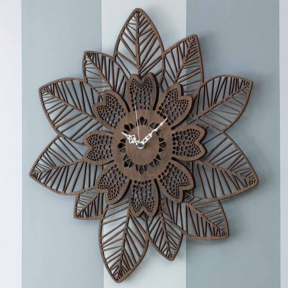 Moderne wandklok, ontwerp in licht hout of wengè, bloemvorm gemaakt in Italië.