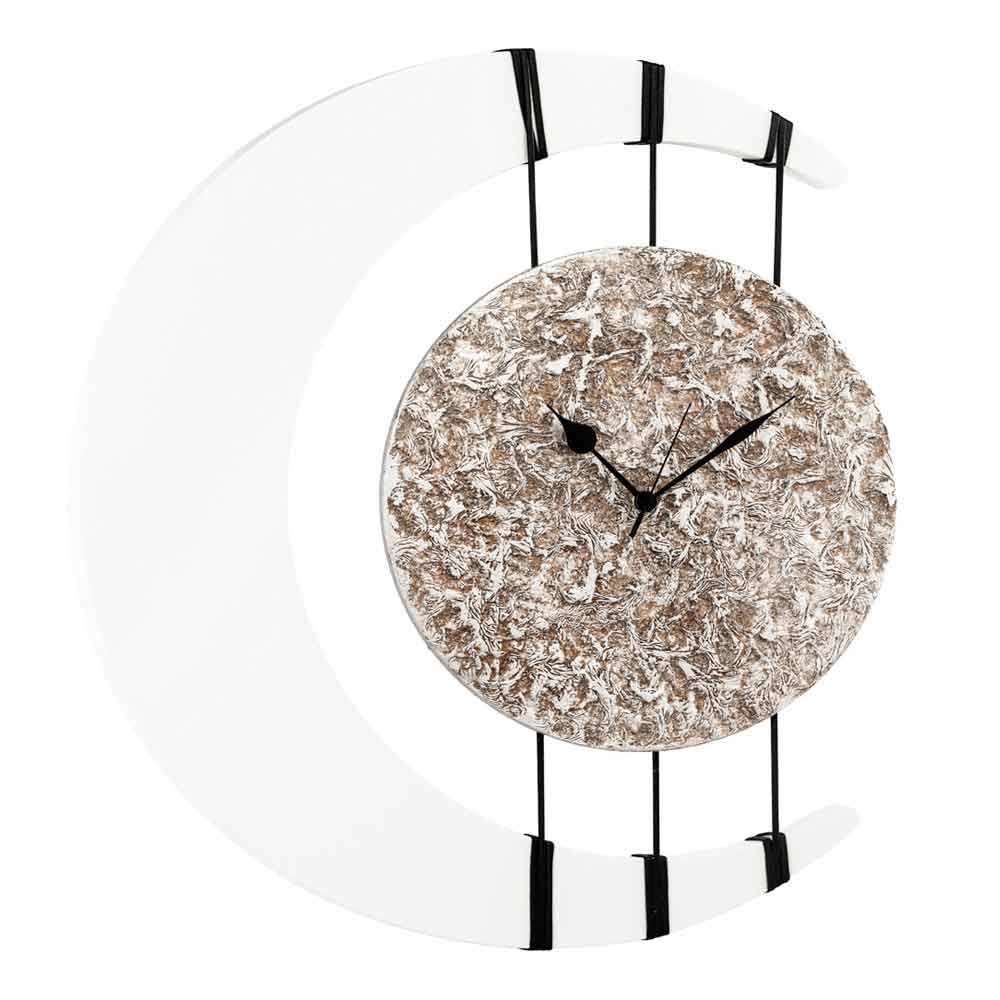Jilly is een gevormde klok, gelakt ivoor, met de hand versierd met bladzilver op materiaal, hangend element aan touwen.