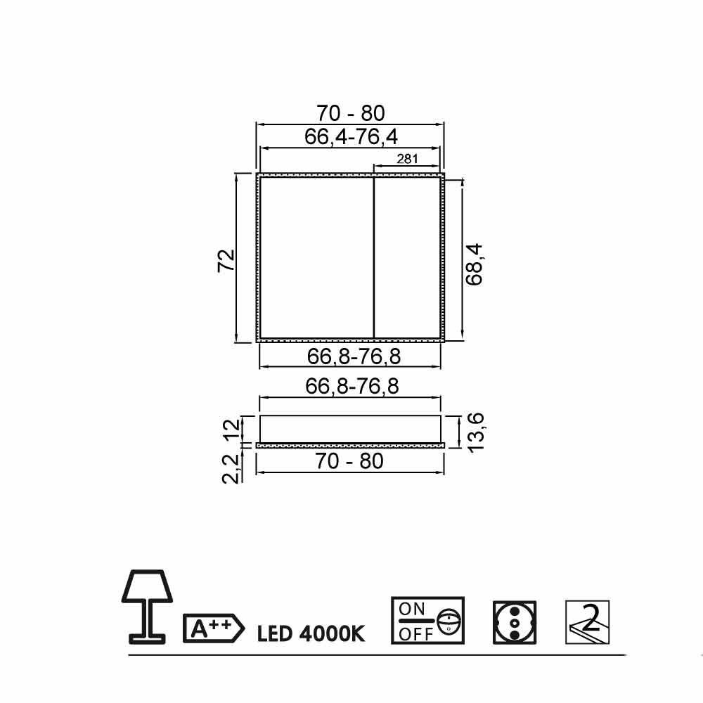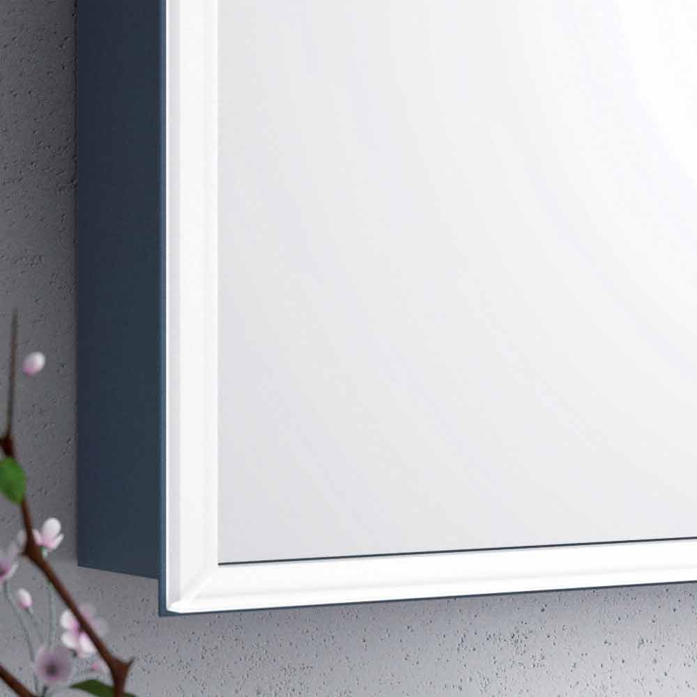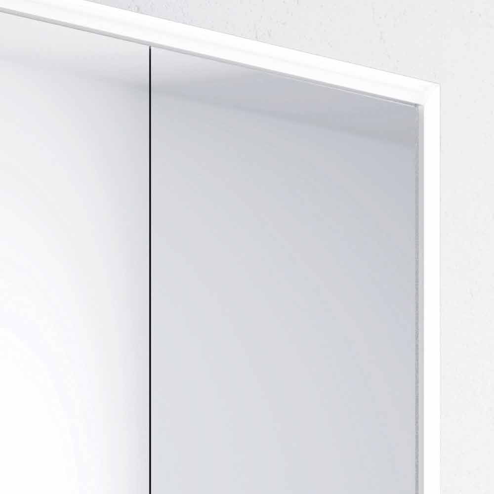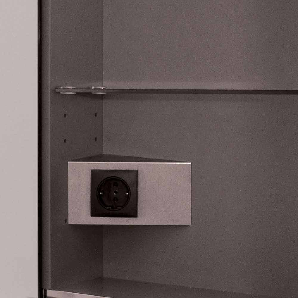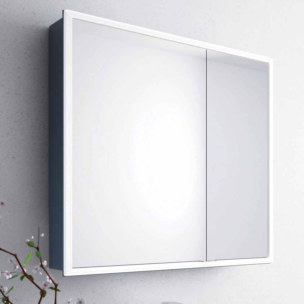 Spiegelkast met 2 deuren met zuivere lijnen waar de verlichting wordt een design element. Structuur FENIX, polymeer materiaal met nano technologische behandeling, waterafstotend, anti-fingerprint en zacht aanvoelt. Geleverd met socket en schakelaar.