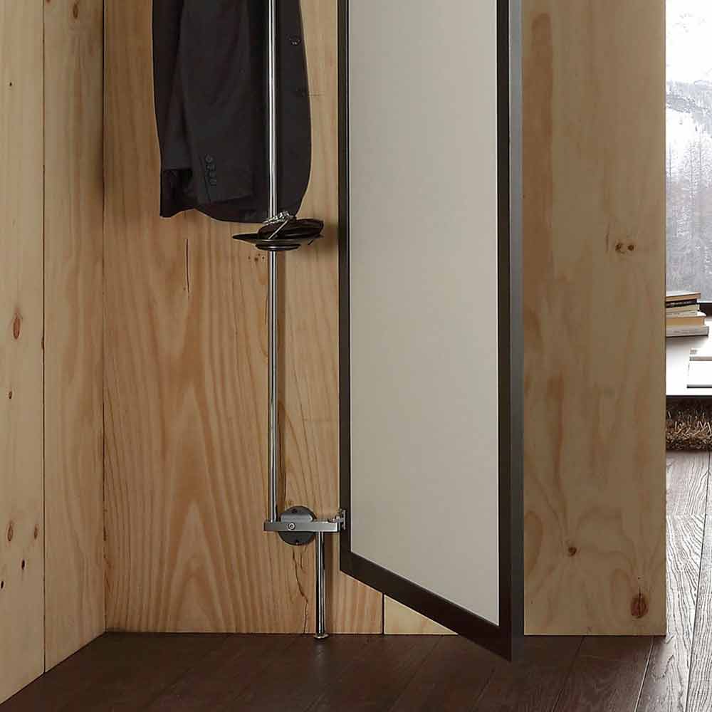 Innovatieve wandspiegel in rookglas met opening gemaakt in Italië met zwart gelakt metalen frame compleet met verchroomd metalen wandsysteem inclusief 3 jashaken en een praktische opbergplaat. Een uiterst eenvoudig en essentieel ontwerp wordt gecombineerd met een origineel en innovatief idee, waardoor een functionele inrichtingsoplossing tot leven komt die zich kan aanpassen aan elke omgeving waarin het een verborgen ruimte creëert die kan worden gewijd aan de organisatie van verschillende objecten. De structuur is ontworpen voor de hoekruimtes van het huis die vaak niet worden gebruikt, maar die kunnen worden omgevormd tot praktische ruimtes om tassen, jassen en meer te plaatsen, waardoor een schone en opgeruimde omgeving wordt behouden.