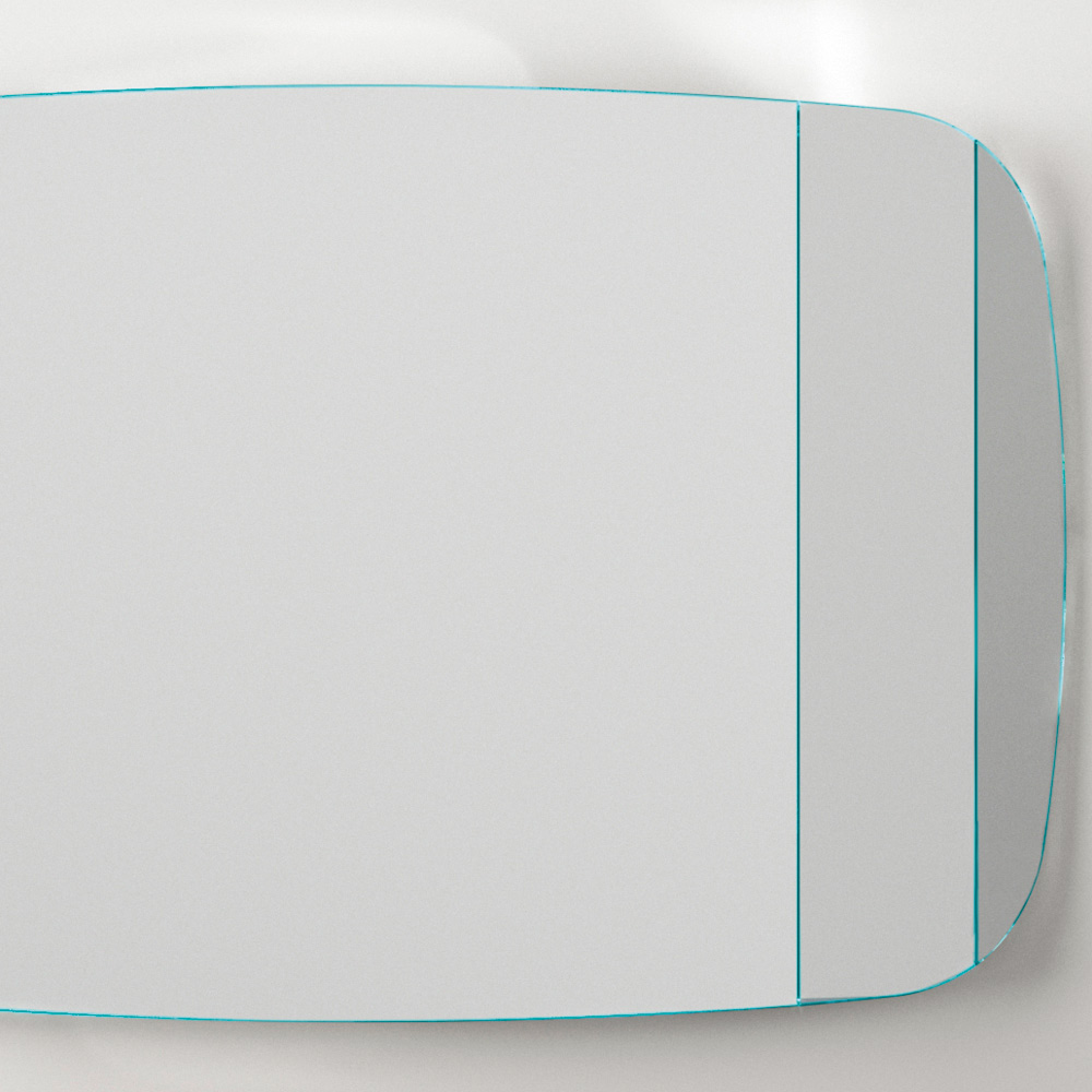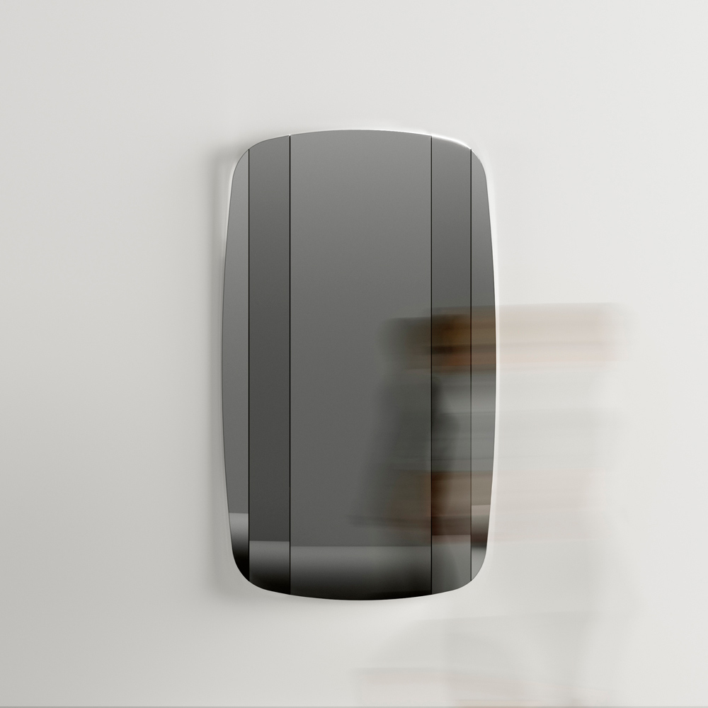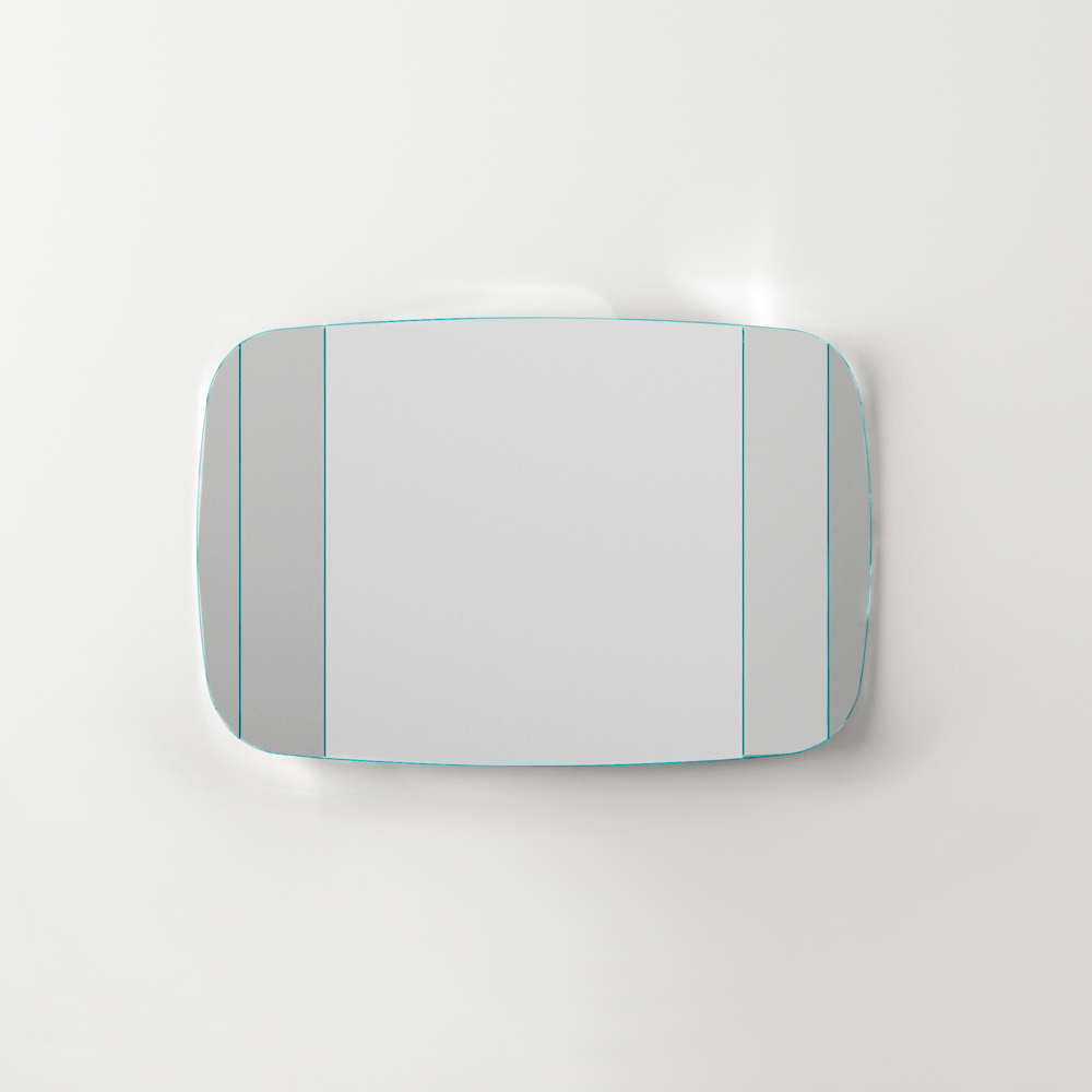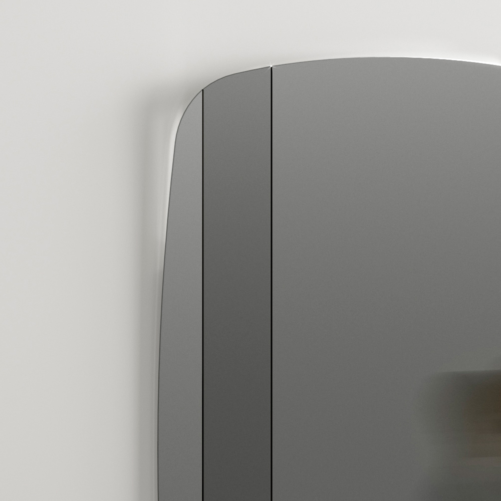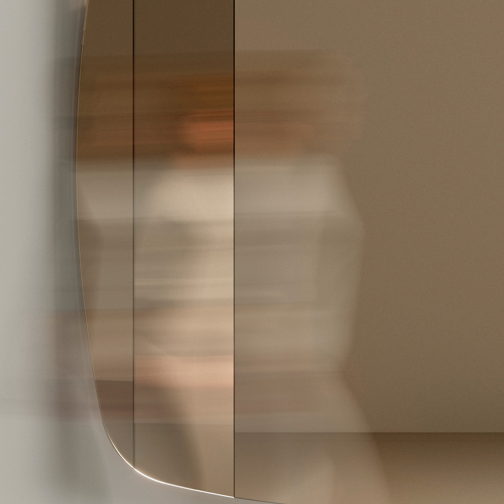 Een buitenmaatse edelsteen, een spiegelsculptuur. De zijdelingse facetten creëren een gevoel van stevigheid verlicht door de kromming van het profiel en spreken hun eigen beeldtaal. Door schuine vlakken naast gebogen lijnen te plaatsen, creëert hij een strak maar verfijnd object dat op het eerste gezicht opvalt.
