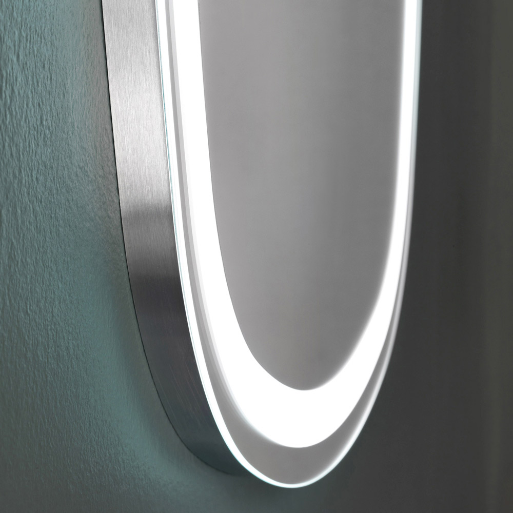 Deze wandspiegel met een geprofileerd en modern design is voorzien van een roestvrijstalen frame en geïntegreerd 4000k LED-licht.