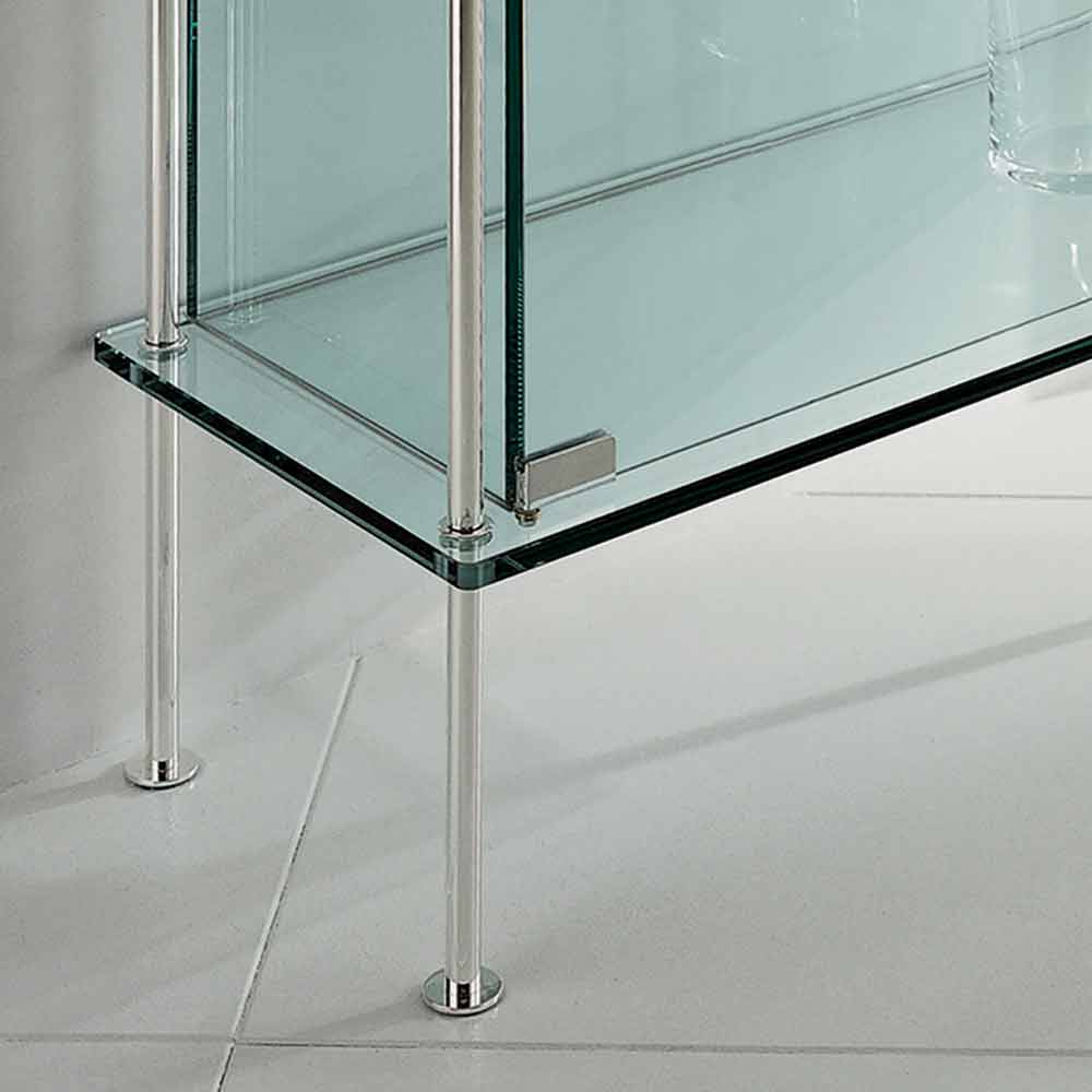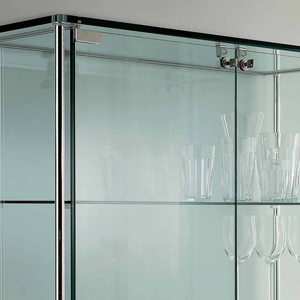 De tweedeurs vitrinekast is geheel gemaakt van transparant gehard glas met roestvrijstalen metalen sluiting en steunen.