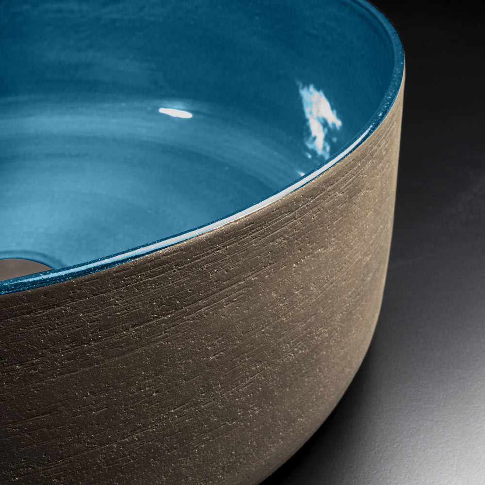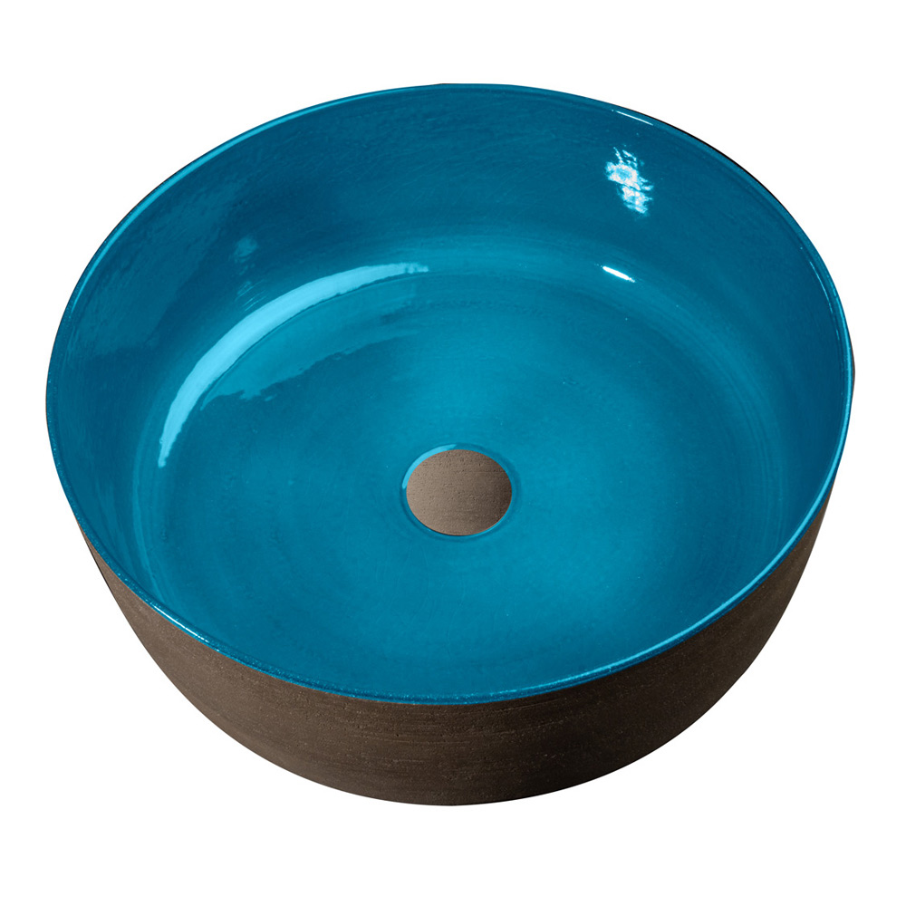 Ronde aanrechtwastafel volledig gemaakt in Italië in vuurvaste klei , met de hand gedraaid met koken op het derde vuur. Zijn esthetiek wordt gekenmerkt door de perfecte combinatie van de natuurlijke gewaxte en waterdichte buitenkant met een meer rustieke stijl en de glanzende en verglaasde blauwe afwerking met een meer elegante en verfijnde smaak. Elk element van de wastafel is met de hand gemaakt om leven te geven aan een exclusieve inrichtingsoplossing, van hoge waarde en van ongeëvenaarde kwaliteit.