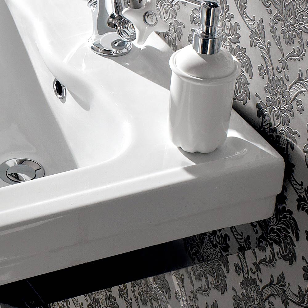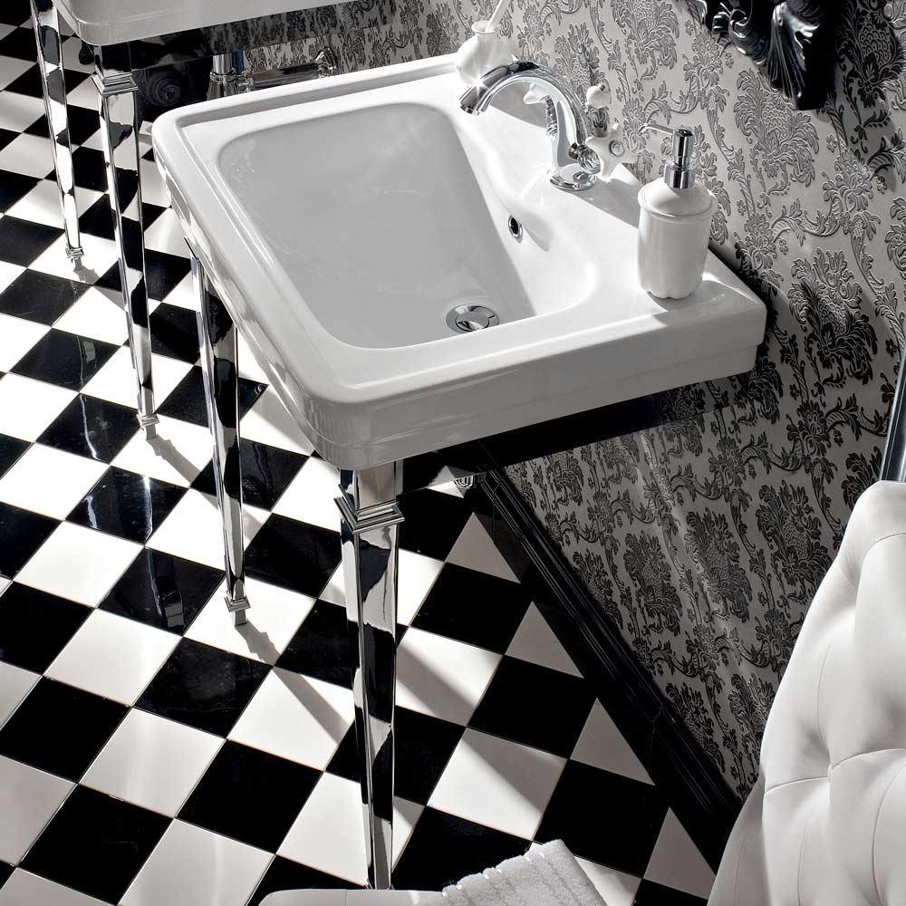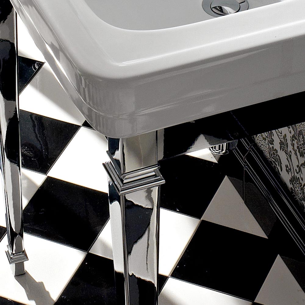 De stijl van deze console wastafel kan worden gedefinieerd als neoklassiek: design en retro lijnen worden gecombineerd met materialen met een moderner karakter, zoals metaal.