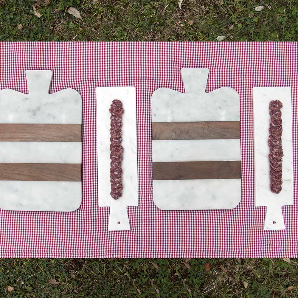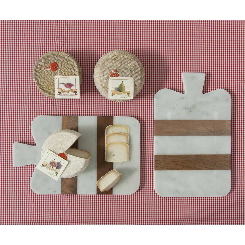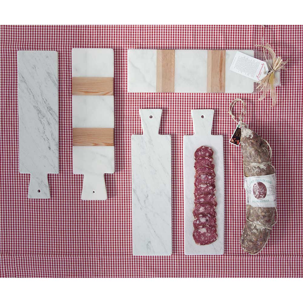 Rechthoekige snijplank verkrijgbaar in 2 formaten gekenmerkt door hoogwaardig wit Carrara-marmergebruikt voor de realisatie en door de houten inzetstukken . Het bevat ook een praktisch gat in het handvat om op te hangen. Het is een uniekstuk omdat elk blok marmer anders is in aders en tinten. Geboren uit de handen van Italiaanse ambachtslieden die al generaties lang gespecialiseerd zijn in marmerverwerking en om deze reden moet elke variatie in vorm en kleur worden beschouwd als een garantie voor vakmanschap. Het marmer dat voor de realisatie van het product wordt gebruikt, is afkomstig uit de steengroeve Poggio Silvestre, een bron van eerste kwaliteit wit marmer dat sinds de vorige eeuw is geclassificeerd.