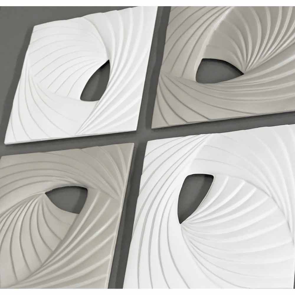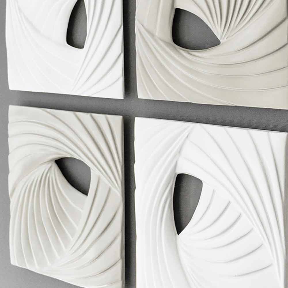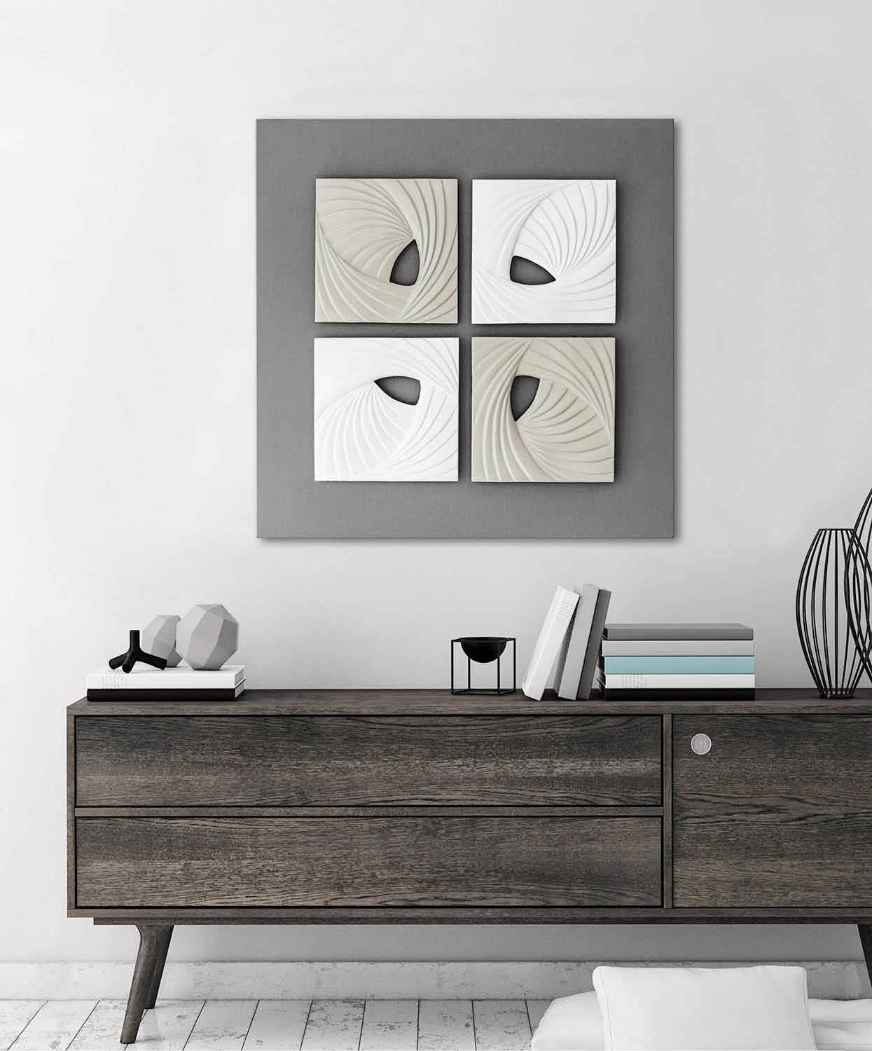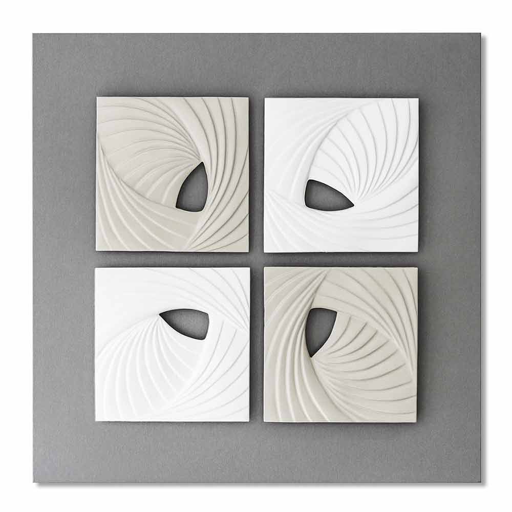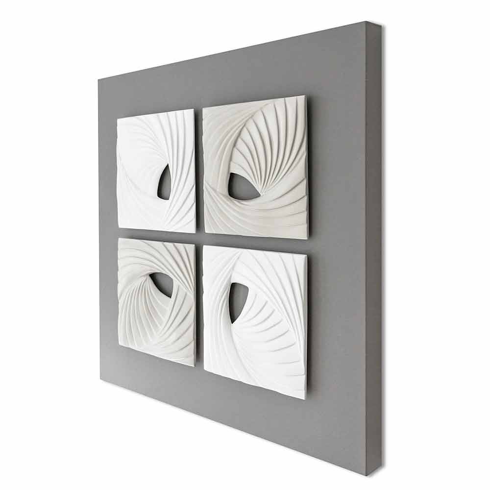 Modern design wanddecoratie bas-reliëf van wit en grijs keramiek overhangend op canvas, gemaakt in Italië.