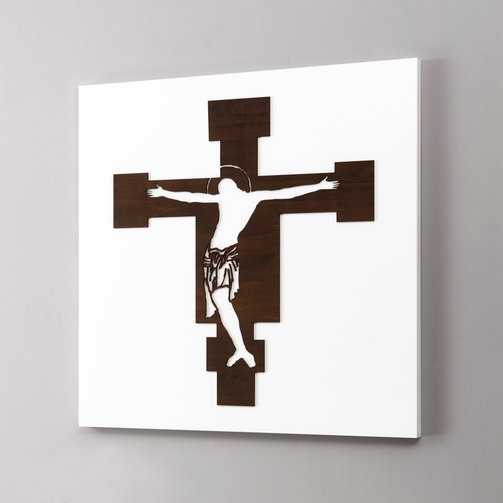 Heilig kader in wit gelakt hout met applicatie van een crucifix in wengé hout.