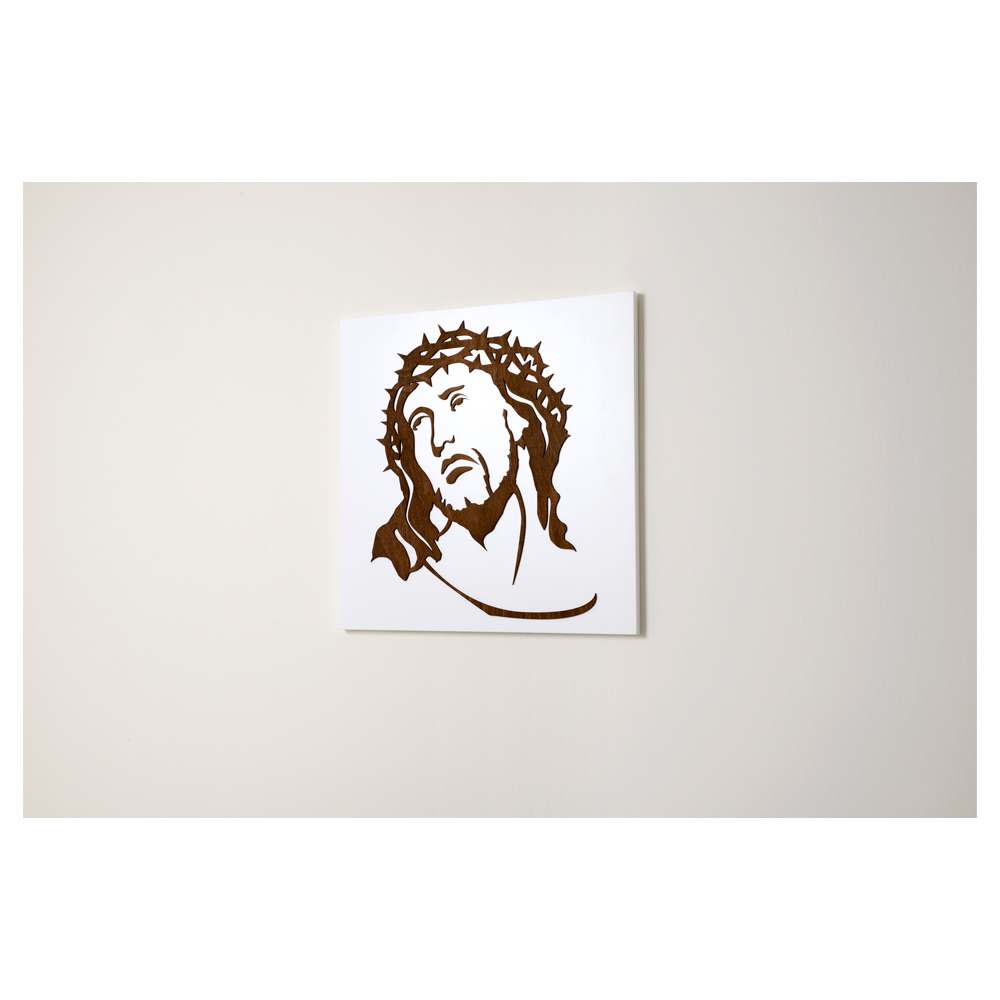Heilig kader in wit gelakt hout met applicatie van het gezicht van Christus in wengé hout.