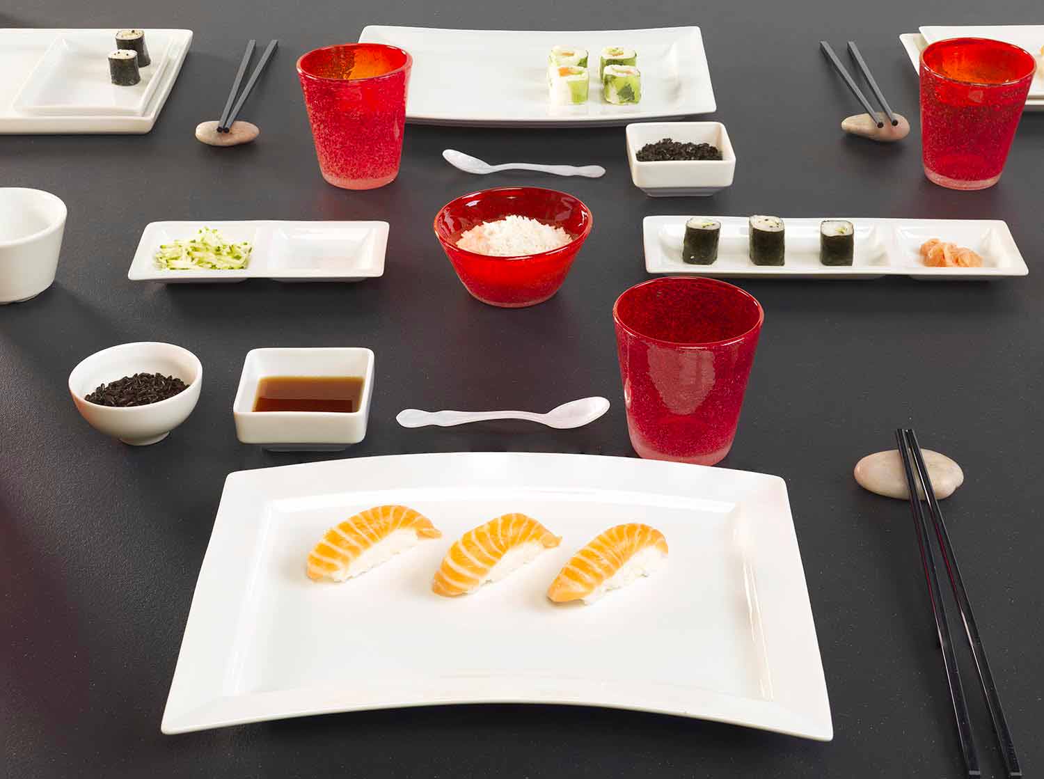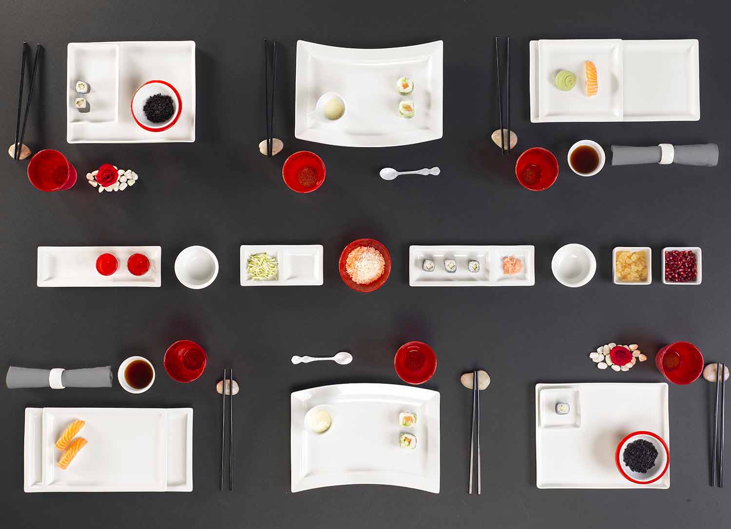 Aziatische minimalisme te onderstrepen en om zich in volgorde aan te passen aan het eten dat ze verwelkomen, terwijl het tijdens de maaltijd een gevoel van welzijn geeft.