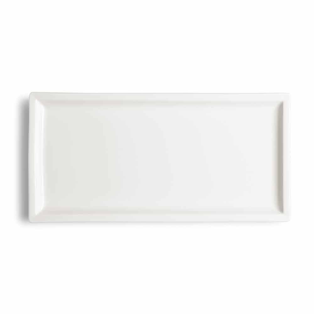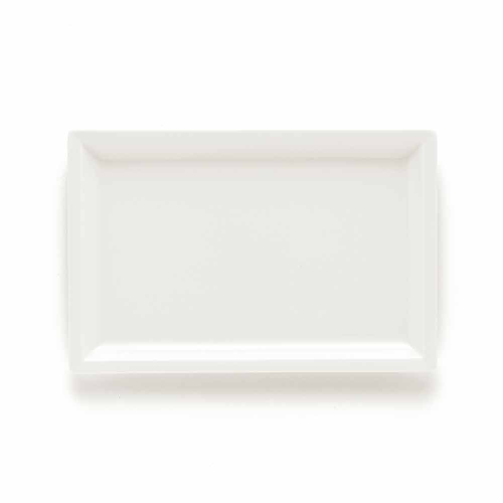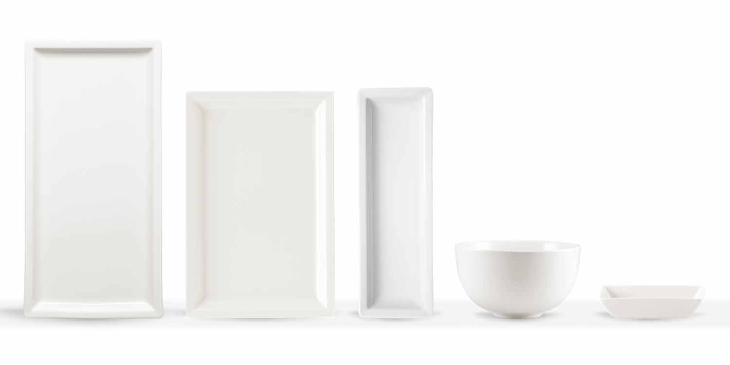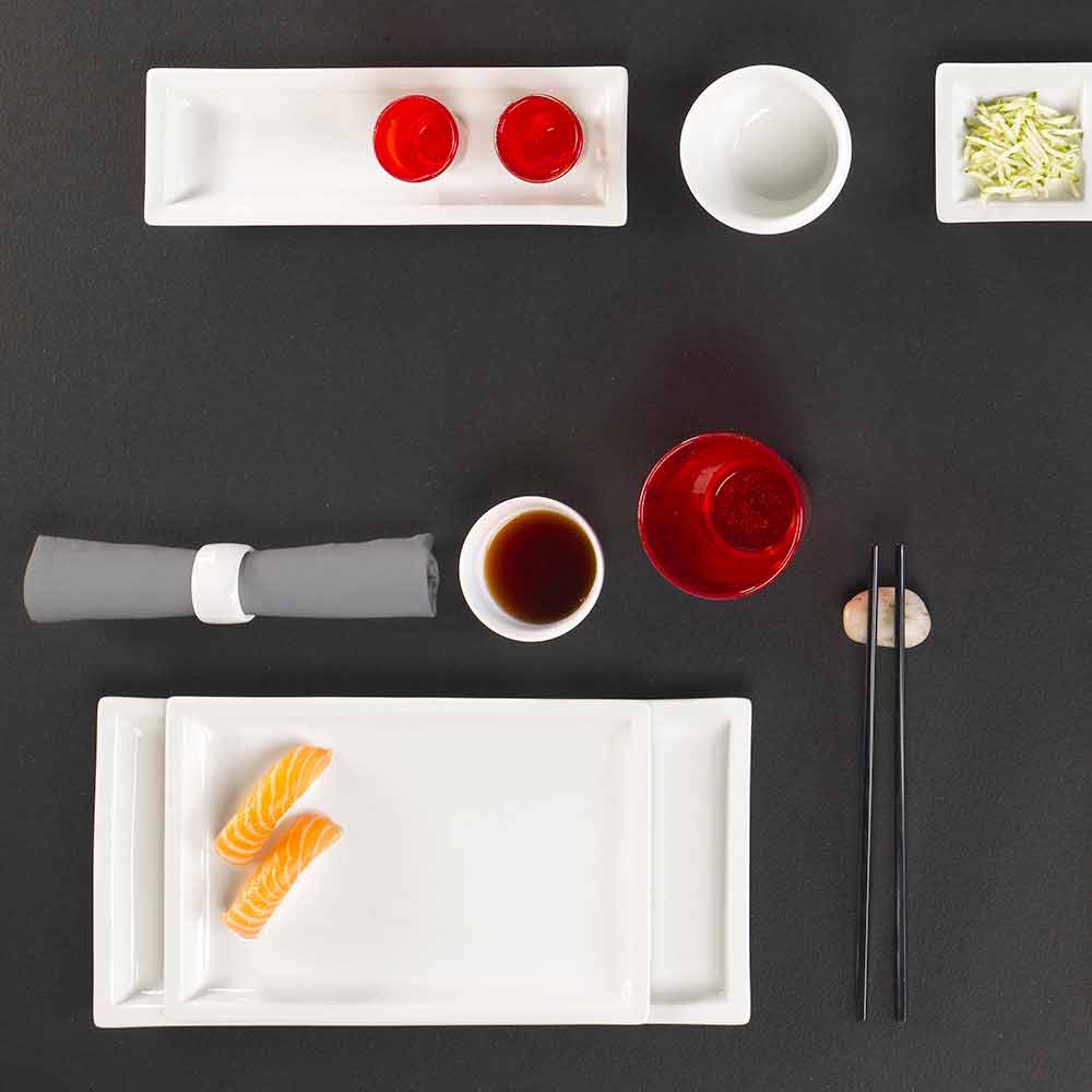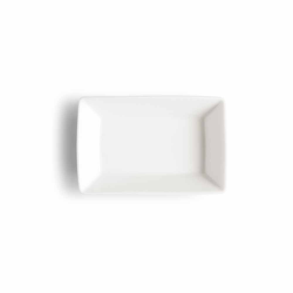 Borden voor op tafel met een modern design, in rechthoekig wit porselein, compleet met 25 stuks.