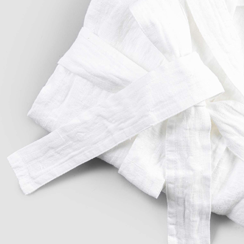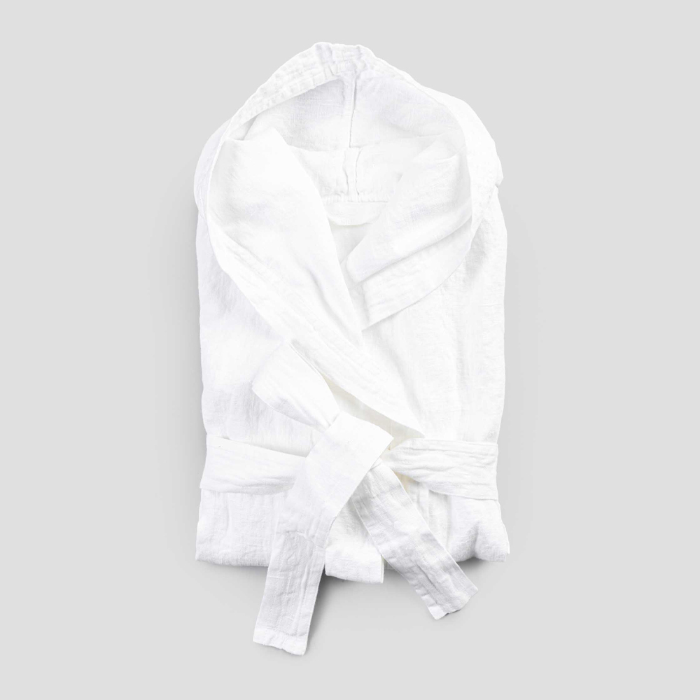linnen badjas met capuchon, verkrijgbaar in wit in verschillende maten.