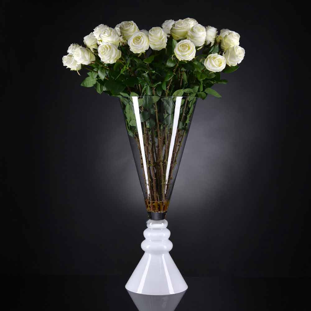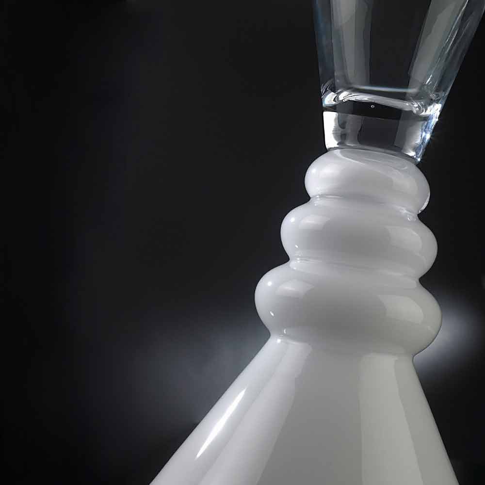 Binnenvaas in transparant glas met witte basis gemaakt met een 100% Made in Italy-verwerking . Een aanvulling die wordt gekenmerkt door een eenvoudige en zuivere esthetiek, onderstreept door extreme elegantie en veelzijdige afwerkingen waardoor het in elke omgeving met een verfijnde stijl kan worden gebruikt. Een ideaal ontwerp voor de meest uiteenlopende omgevingen, van woninginrichting tot die van hotels, restaurants, contractruimtes, spa's, maar ook als decor voor evenementen en bruiloften.