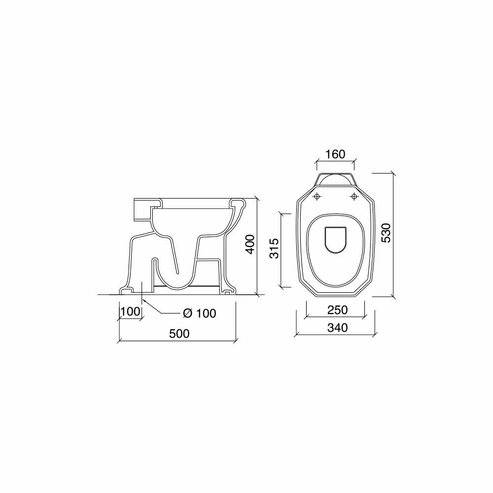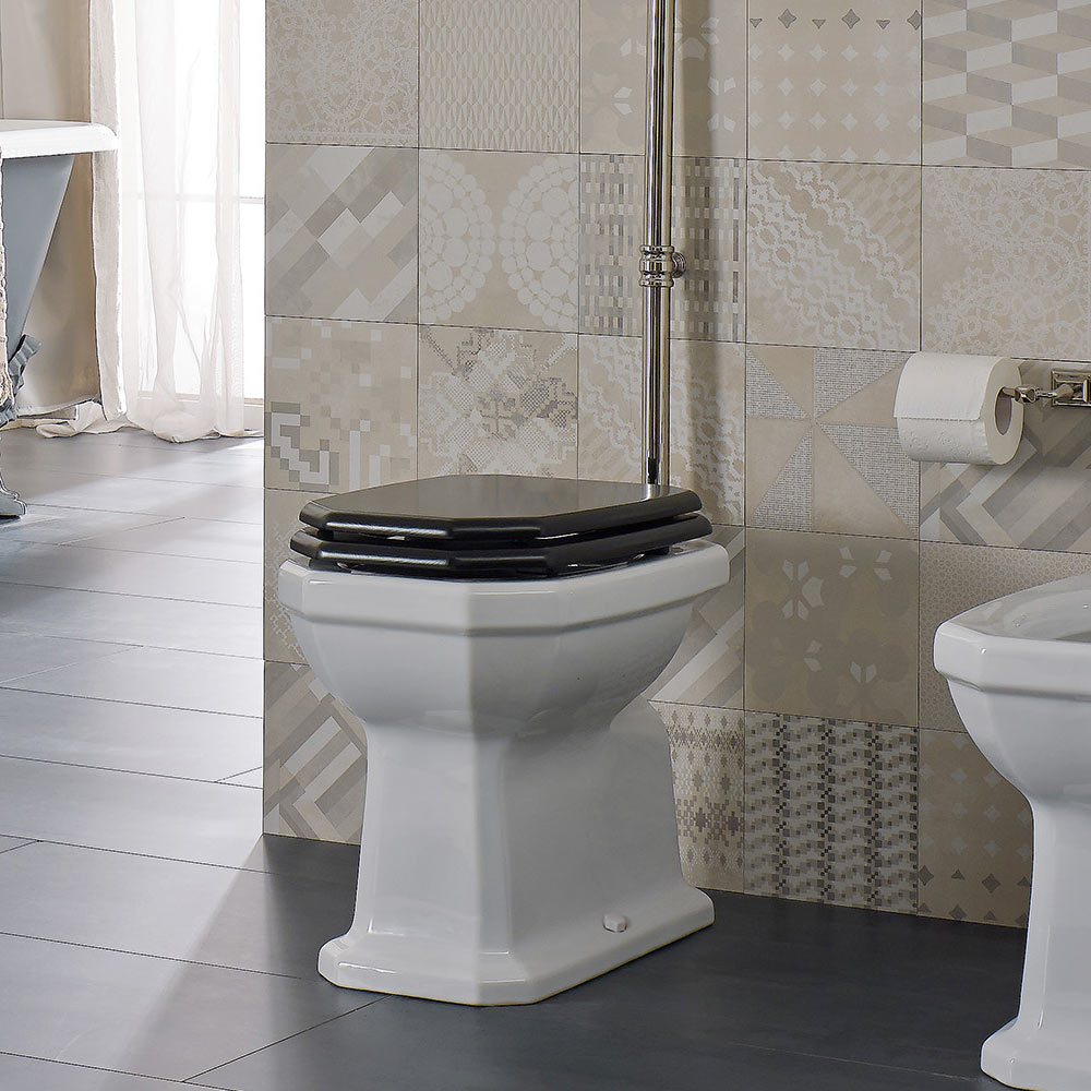 Gemaakt in Italië, staande witte keramische toiletpot met zwarte Nausica-zitting.