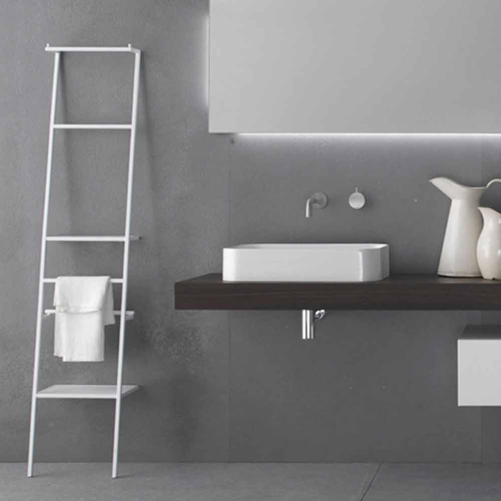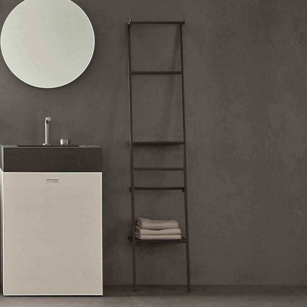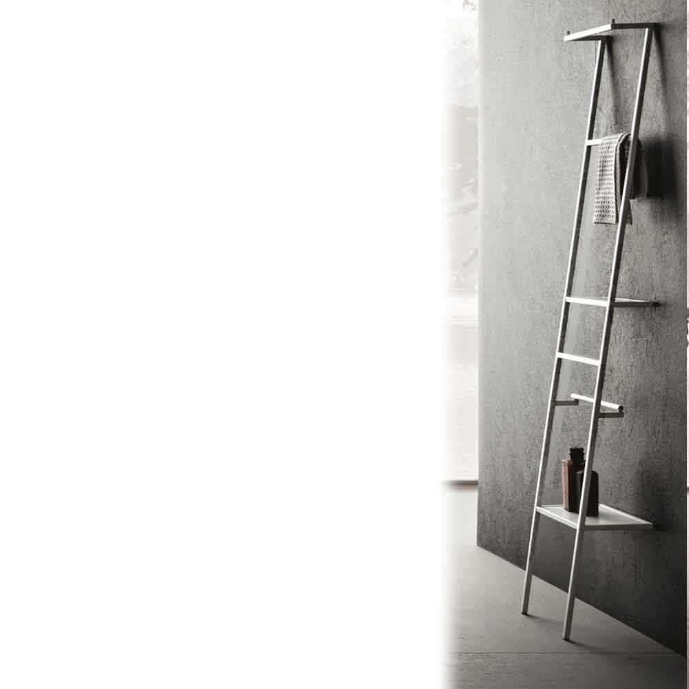 Hangladder van mat geverfd metaal met een minimaal en uiterst functioneel ontwerp. Het is uitgerust met planken, haken voor badjassen, rolbeugels en handdoekrekken.