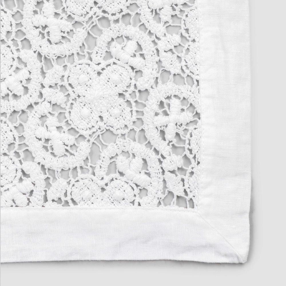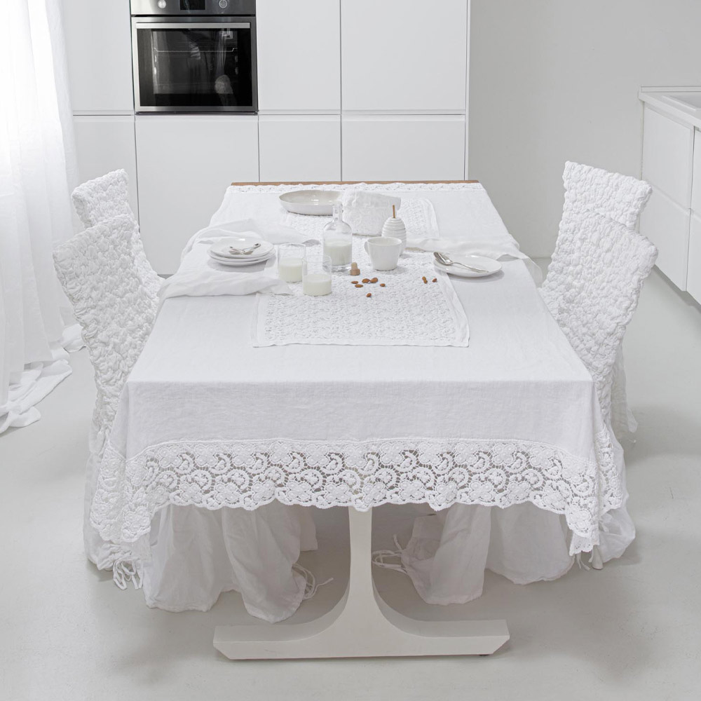 Tafelloper van gehaakt kant met een rand van een mix van linnen en katoen, luxe ontwerp gemaakt in Italië.