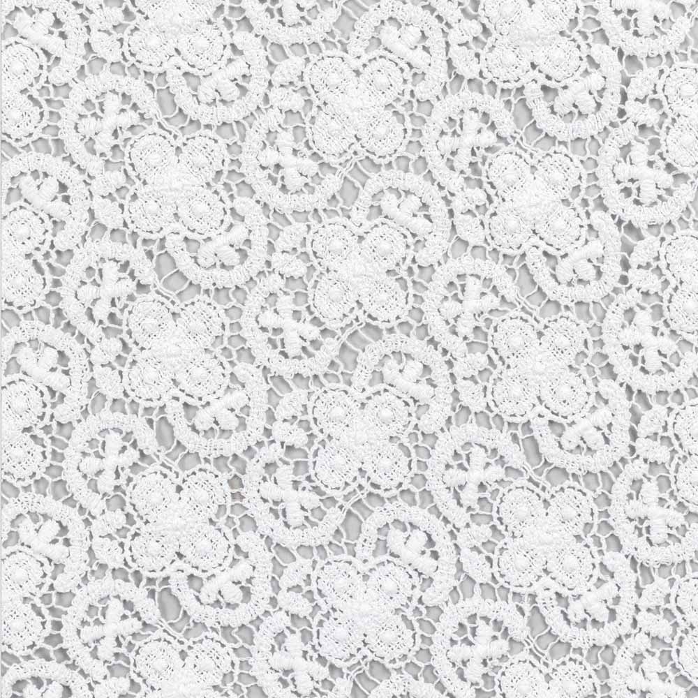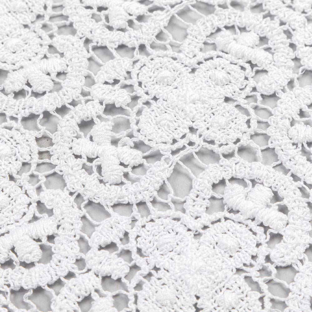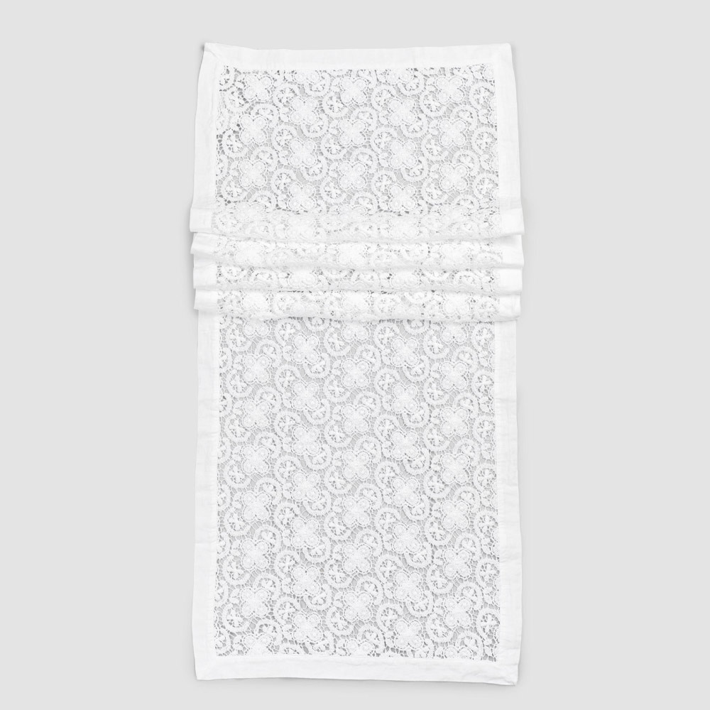 De witte decoratie loper is geheel geborduurd met gehaakt kant en heeft een linnen en katoen mix rand met vouw.