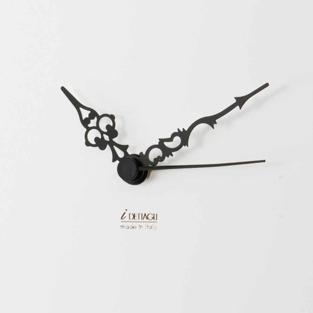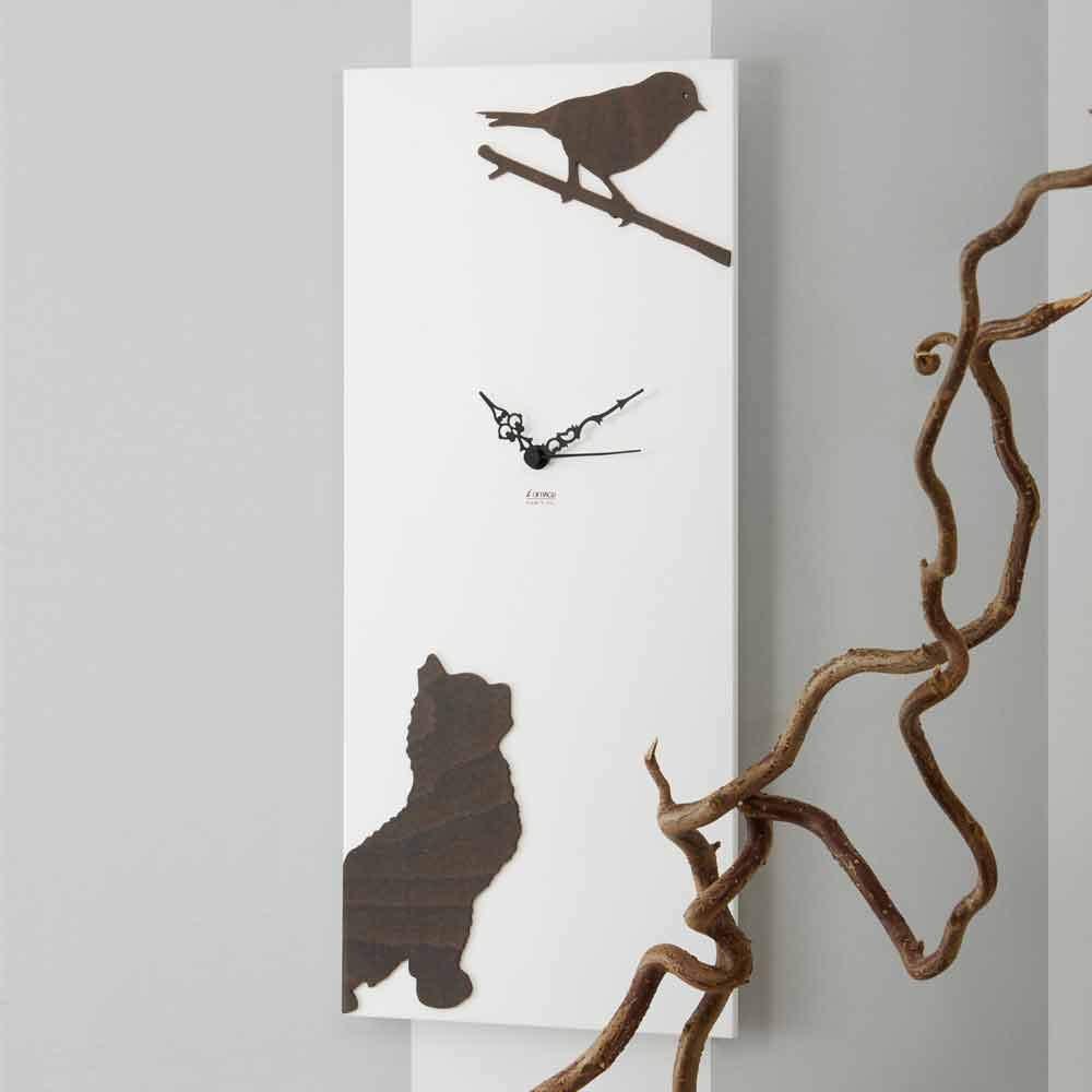 Rechthoekige wandklok in mat wit hout met vogel- en kattenmotief, modern design made in Italy.