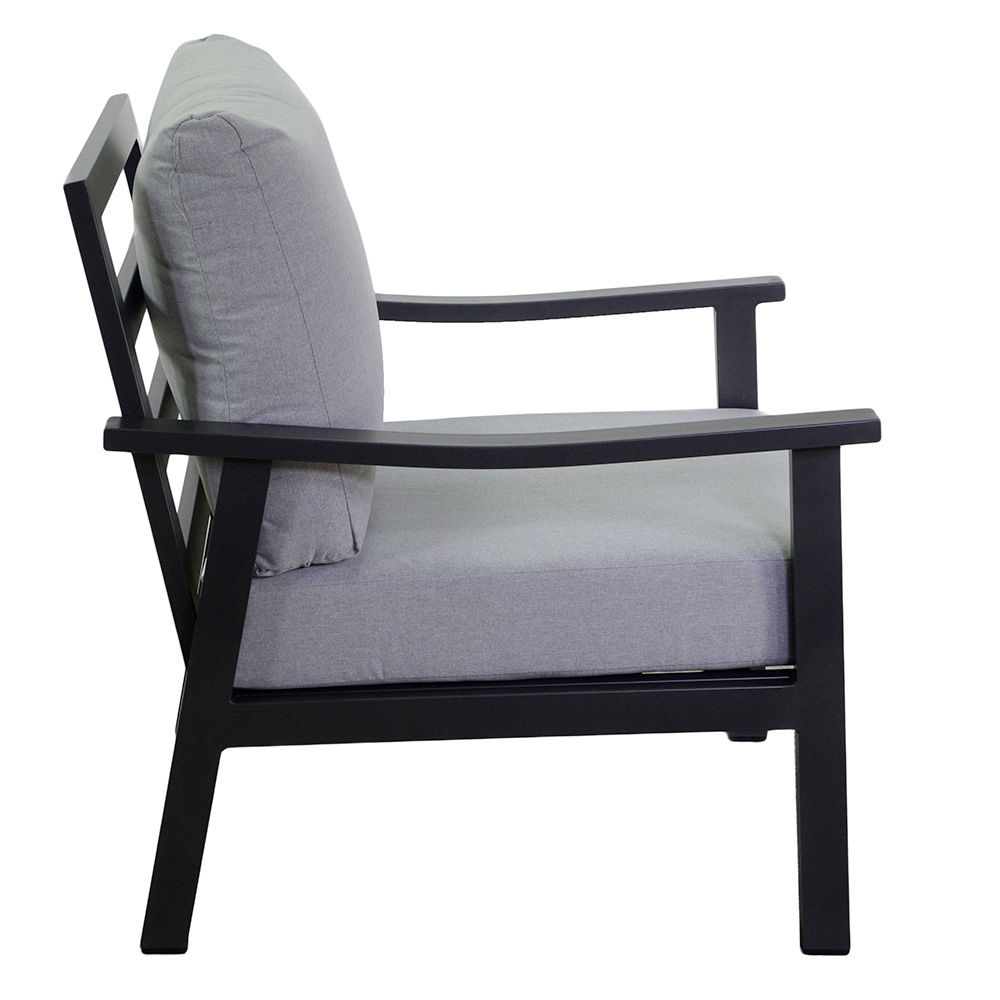 Ontdek tijdloze elegantie en comfort met onze antraciet aluminium lounge . Elk stuk is ontworpen om absolute ontspanning te bieden dankzij de ultra-zachte kussens in lichtgrijze stof die uitnodigen tot momenten van puur welzijn. Het stevige aluminium frame zorgt voor duurzaamheid en stabiliteit , ideaal voor dagelijks gebruik buitenshuis.