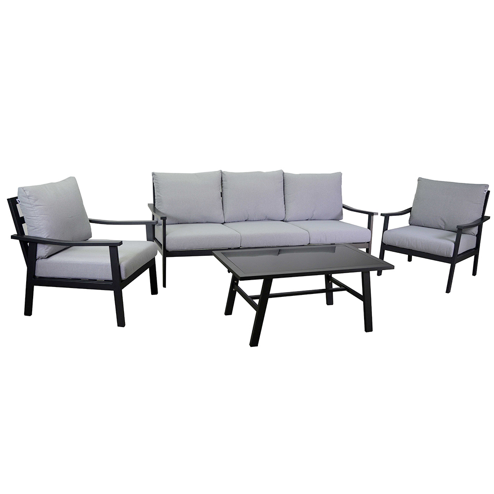 Het ensemble wordt gecompleteerd door een glazen middentafel , perfect voor het houden van drankjes en hapjes, waardoor deze set het middelpunt wordt van elke sociale bijeenkomst buitenshuis. Het minimalistische en eigentijdse ontwerp van de lounge past naadloos in elke buitenruimte en voegt een vleugje moderne stijl toe.