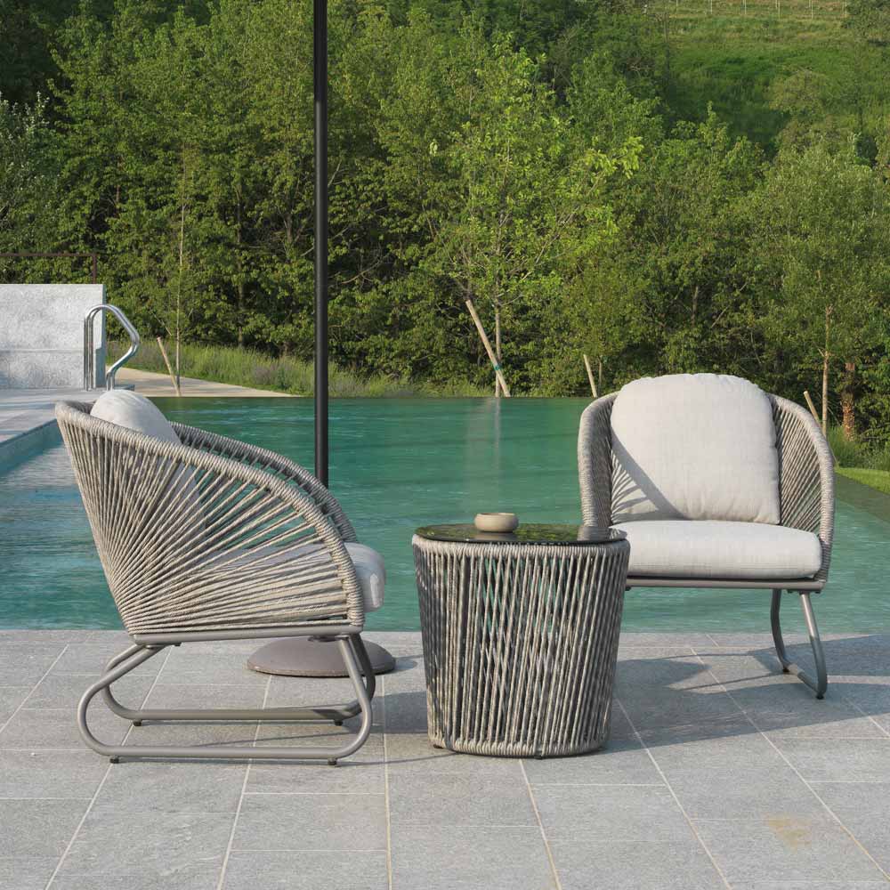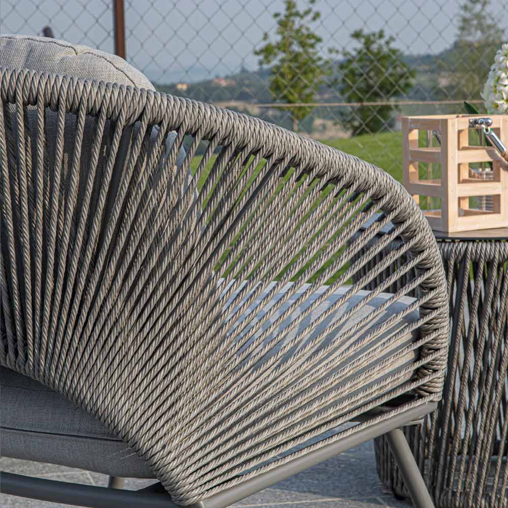 Ontdek de charme en het comfort van onze living room , een perfecte combinatie van stijl en functionaliteit voor uw buitenruimte. De armstoelen bieden superieur comfort met hun gevoerde kussens in grijstinten, ideaal voor lange momenten van ontspanning onder de zon of onder de sterren.