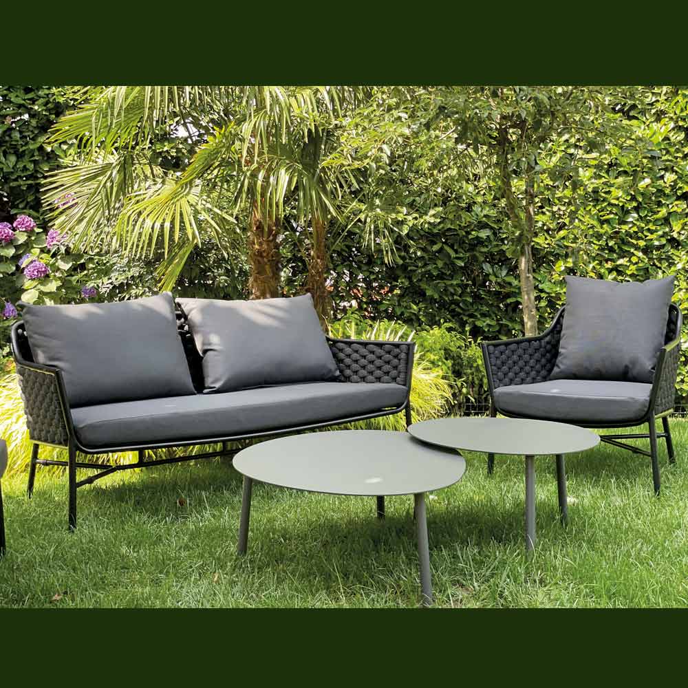 Deze set, bestaande uit een bank, fauteuil en bijpassende salontafels , is perfect voor wie op zoek is naar een omgeving waar stijl en functionaliteit harmonieus samengaan. Het donkere kleurenpalet accentueert het omringende groen en creëert een verfijnd visueel contrast.