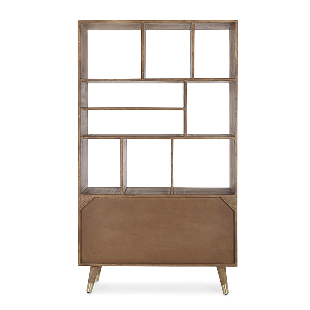 Deze vrijstaande boekenkast heeft een structuur van mangohout met een achterkant van MDF.