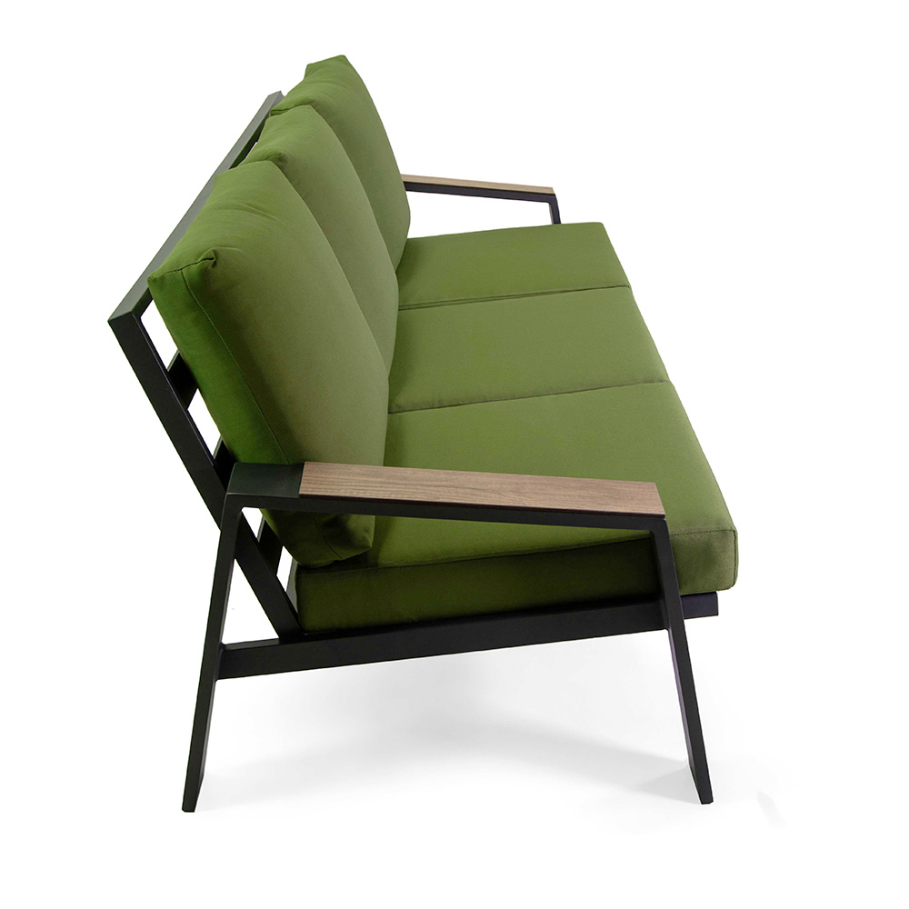 Deze olijfgroene aluminium loungeset , verrijkt met luxueus gevulde kussens , biedt een frisse en natuurlijke sfeer voor uw buitenruimte. De set bestaat uit een driezitsbank , twee enkele fauteuils , en een stevige koffietafel met een HPL blad met houteffect, perfect voor het creëren van een elegante en uitnodigende conversatiehoek in uw tuin of patio. Het moderne ontwerp met strakke lijnen en heldere kleuren integreert perfect in elke buitencontext en voegt een vleugje stijl en comfort toe.