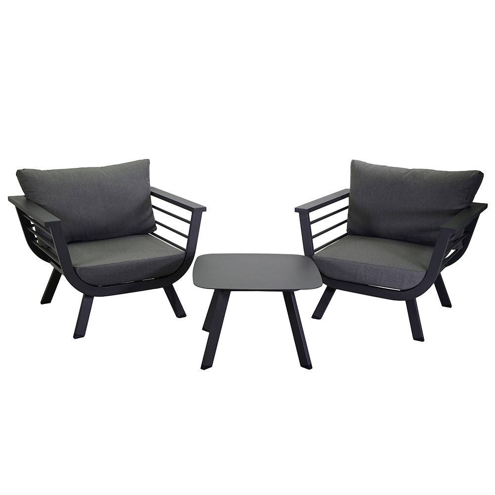 Dompel jezelf onder in comfort en stijl met deze aluminium loungeset , perfect voor elke buitenruimte. Deze set bestaat uit twee ruime fauteuils met kussens , die het ultieme comfort en ondersteuning bieden. De bijpassende salontafel is ideaal om drankjes en boeken binnen handbereik te houden, waardoor uw buitenruimte een ware oase van ontspanning wordt.