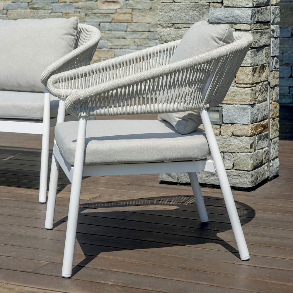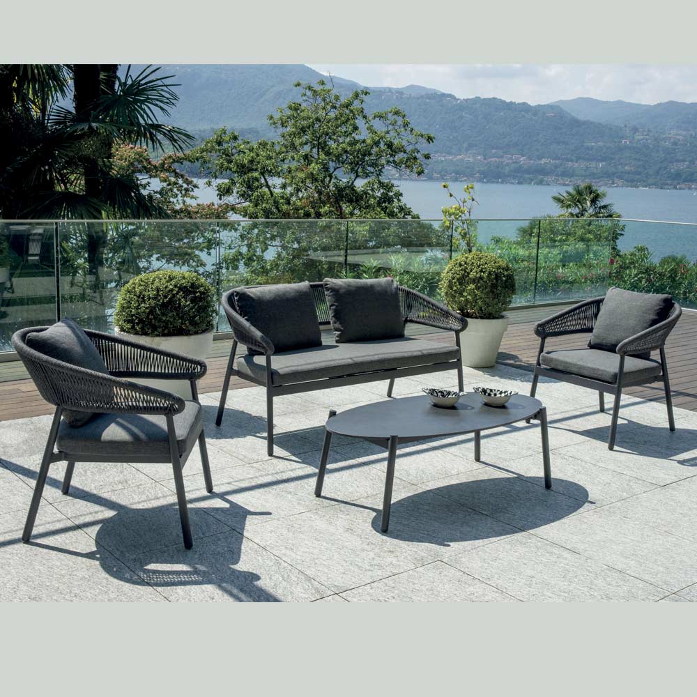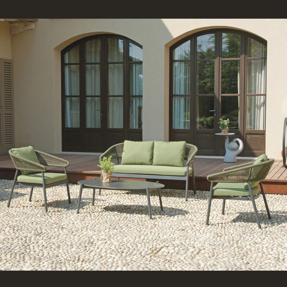 Deze tuinlounge è de ideale oplossing voor wie op zoek is naar een perfecte balans tussen elegantie en comfort. Bestaande uit fauteuils en bank met gestoffeerde kussens en een stevige salontafel, is deze set è de ideale aanvulling om te genieten van ontspannen momenten in de buitenlucht. Het moderne ontwerp en de strakke lijnen passen perfect in elke buitenomgeving, van ruime patio's tot gezellige tuinen.