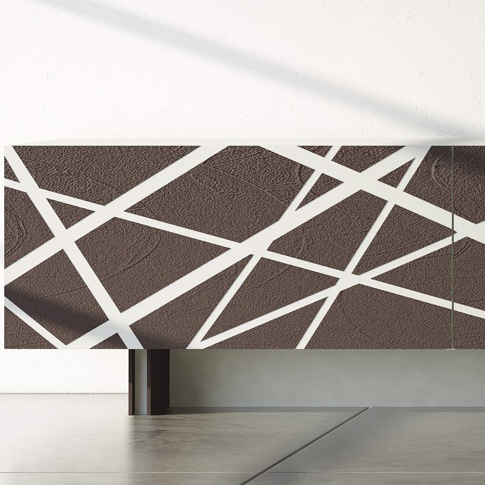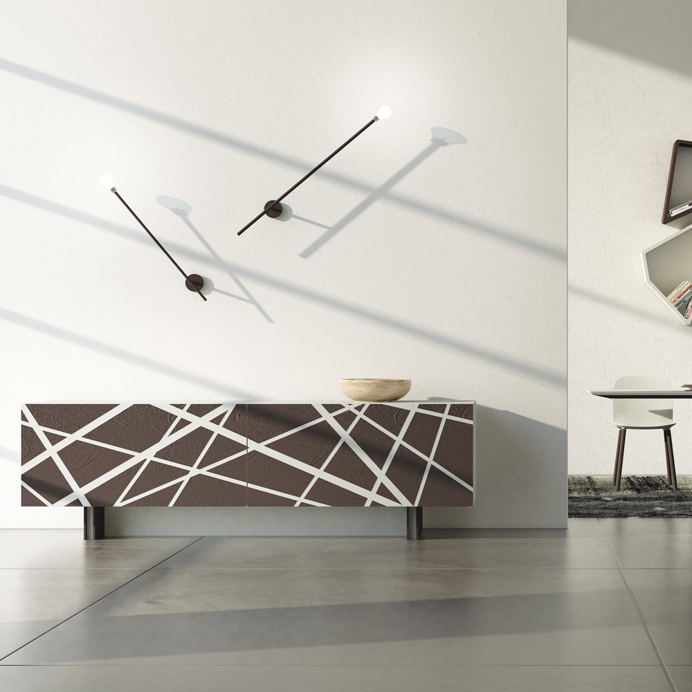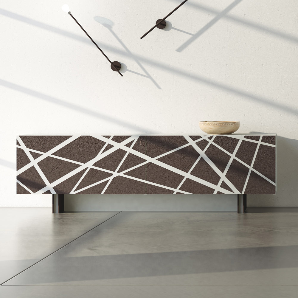 Woonkamerdressoir met MDF-structuur in kleimelamine aan de binnenkant en vulkaanbruin mat gelakt aan de buitenkant. Het openingssysteem heeft 2 coplanaire schuifdeuren en wordt afgeschreven bij openen en sluiten om een perfecte functionaliteit en bruikbaarheid te garanderen. De interne planken zijn uitneembaar en van 8 mm dik glas, terwijl de poten van metaal zijn. Dit product is vol smaak en design dankzij de combinatie van verschillende materialen, de elegante en verfijnde afwerkingen en verfraaid door de decoratie op de deur met wit bas-reliëf. Alle materialen die voor de constructie zijn gebruikt, bieden een uitstekende kwaliteit en weerstand in de loop van de tijd, waardoor het product een uniek en onvergetelijk tintje krijgt.