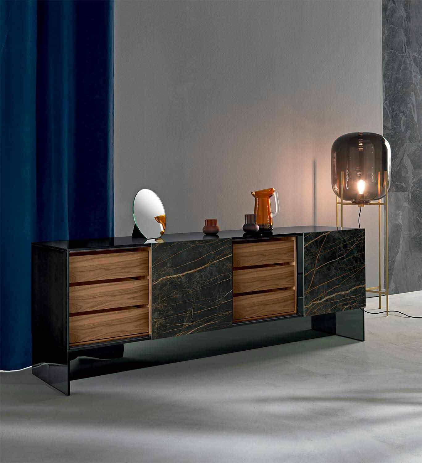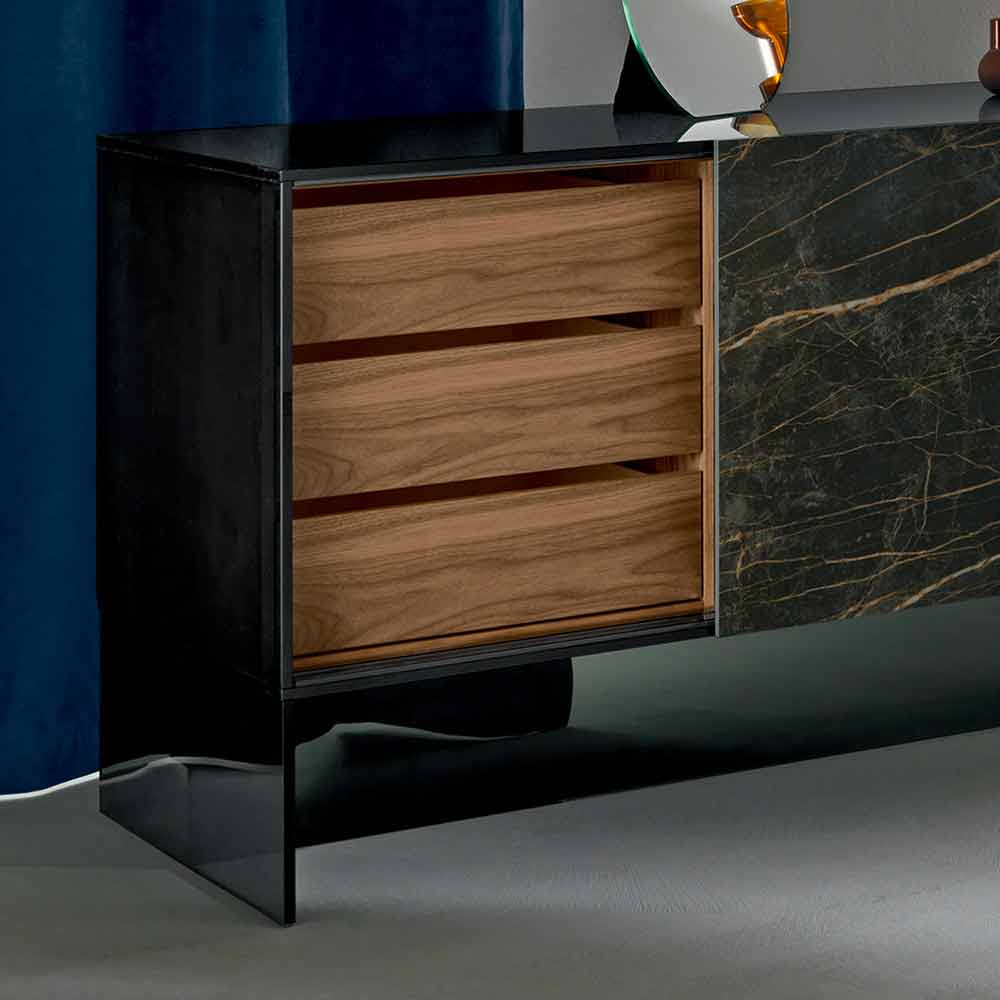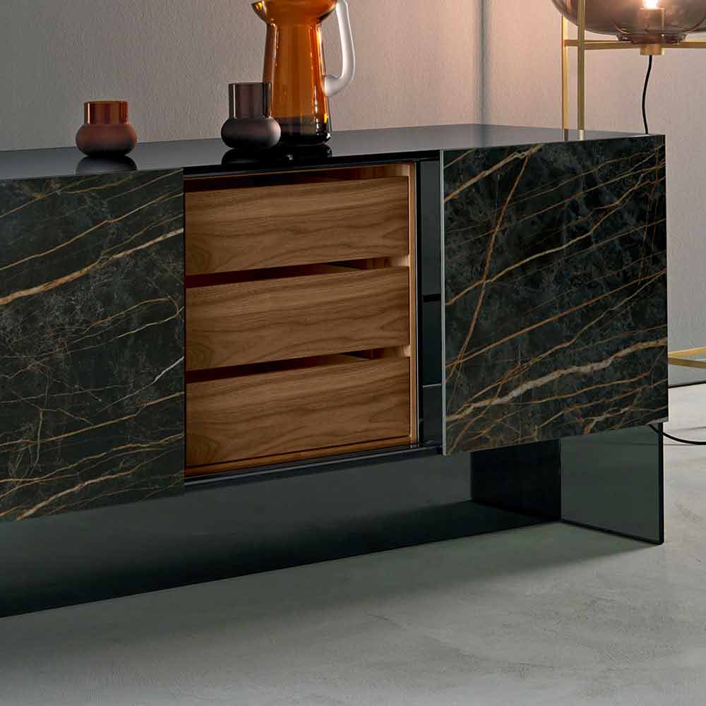 Woonkamer dressoir met een rookglazen structuur en twee glanzende Noir Desir keramische deuren, met de hand gerealiseerd in Italië.