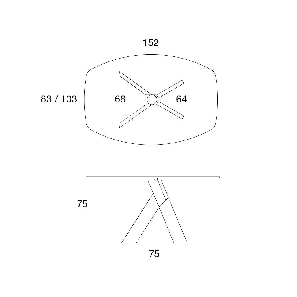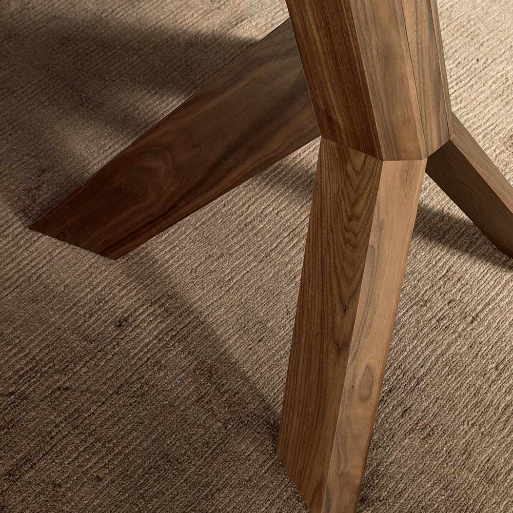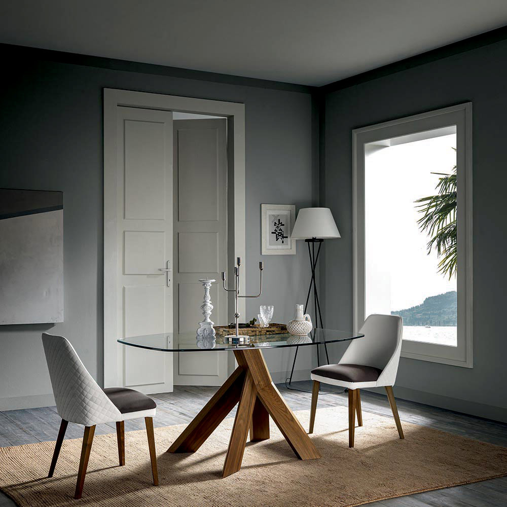 Deze eettafel heeft een structuur met 4 poten in gefineerd hout met een Canaletto walnoot afwerking en een transparant vat in de vorm van gehard glas.