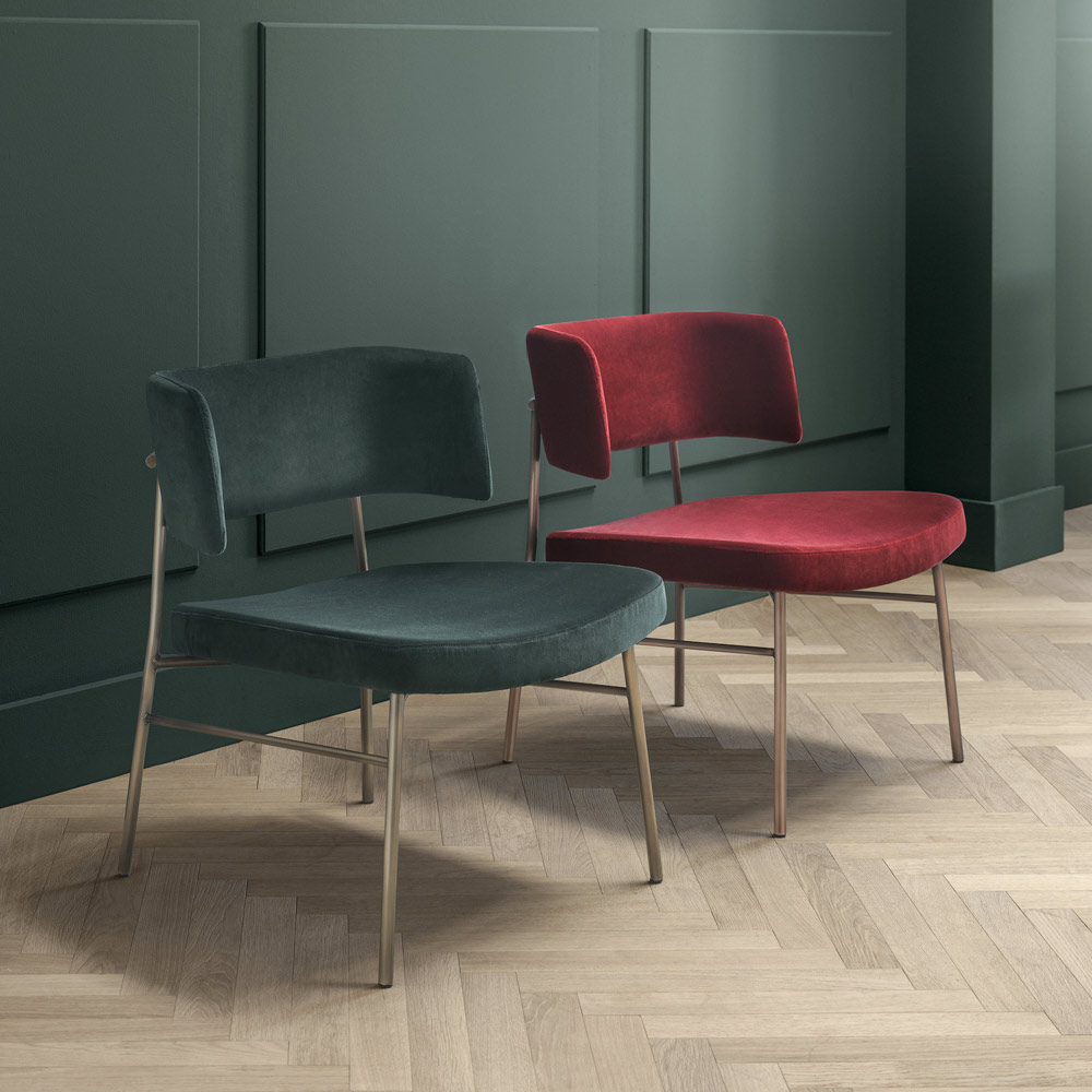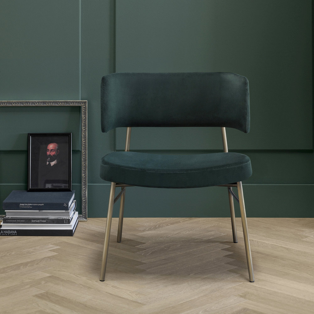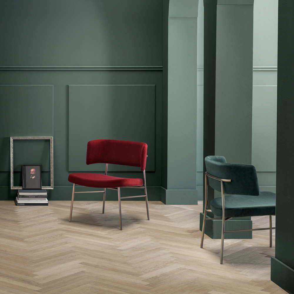 eenvoudige lijnen die de hele structuur omarmen en de tijdloze verfijning van fluweel, een materiaal van grote waarde en met een fascinerende uitstraling. Mede dankzij zijn vorm zorgt deze prachtige fauteuil voor een ergonomische en gastvrije zitting, bestudeerd en ontworpen om momenten te bieden die gewijd zijn aan ontspanning waarin u uzelf kunt laten verwennen.