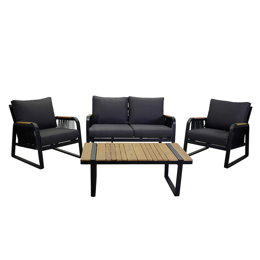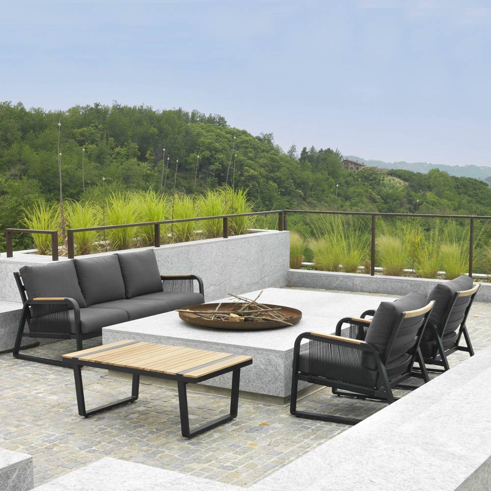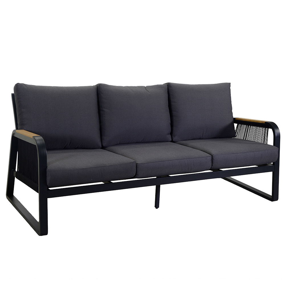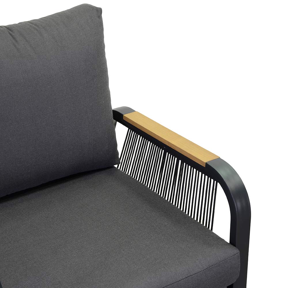 1 sofa: frame in roestvast aluminium met poedercoating in antracietkleur, touwen in geweven polyester in antracietkleur, waterafstotende kussens in donkergrijs polyester, afneembare hoezen en armleuningen in TEAK hout uit Brazilië