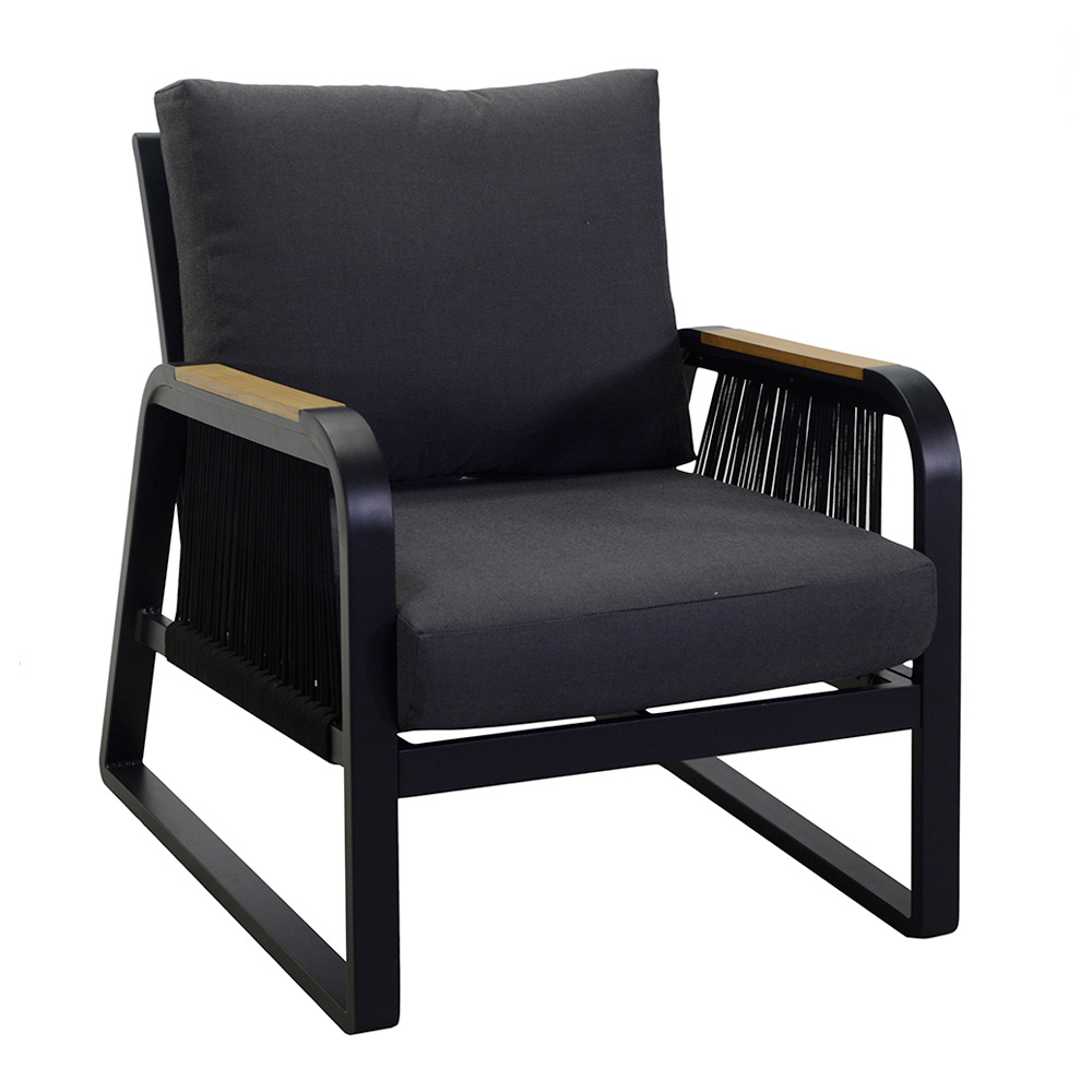 2 fauteuils: frame in roestvast aluminium met poedercoating in antraciet, touwen in geweven polyester in antracietkleur, waterafstotende kussens in donkergrijs polyester, afneembare hoezen en armleuningen in TEAK hout uit Brazilië