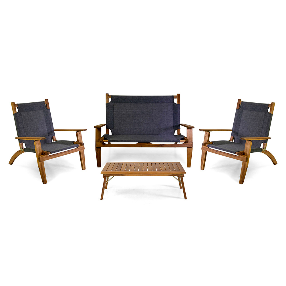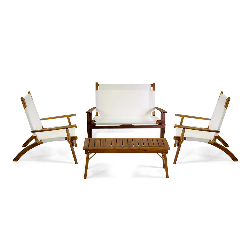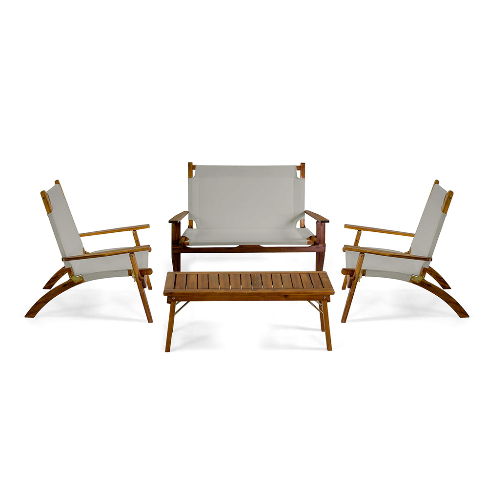 Deze elegant ontworpen houten loungeset is ideaal voor wie op zoek is naar comfort en stijl in één product. Perfect om buiten te ontspannen, deze set bestaat uit twee armstoelen , een sofa en een koffietafel , allemaal voorzien van een stevig gebogen houten frame en duurzame stoffen details. De strakke lijnen en het slimme gebruik van materialen maken het de ideale keuze voor elke buitenruimte , van de tuin tot het terras, en bieden een hoek van pure ontspanning waar u kunt genieten van momenten van rust of vrienden en familie kunt verwelkomen. De uitnodigende stoelen zorgen voor maximaal comfort, waardoor het de perfecte plek is voor elke gelegenheid om buiten te ontspannen.