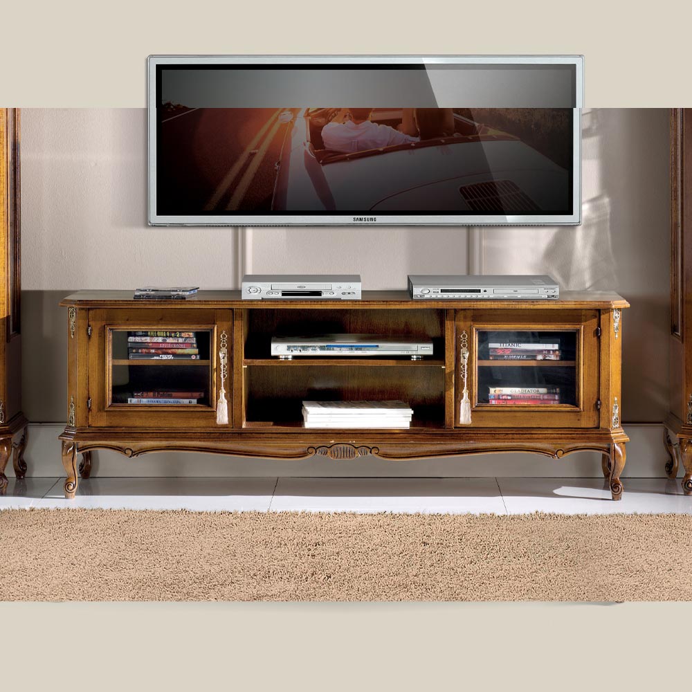 Deze tv-meubel, ontworpen om uw woonkamer een vleugje klassieke stijl te geven, is gemaakt van fijn Bassano-notenhout. Dit praktische meubel heeft twee deuren en twee compartimenten. Uniek en verfijnd, volledig gemaakt in Italië en met de hand vervaardigd door bekwame ambachtslieden , afgewerkt met vakmanschap en elegantie. Het productieproces maakt gebruik van hoogwaardige materialen en wordt met de hand uitgevoerd met de grootste zorg en professionaliteit die kenmerkend is voor Made in Italy -producten.