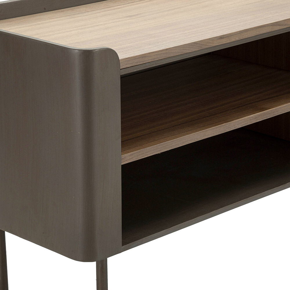 Dit tv-meubel van hout en ijzer is de essentie van functionele elegantie en verfijnd design. Met zijn strakke lijnen en minimalistische stijl past hij discreet in elke omgeving, terwijl hij dankzij de praktische en gemakkelijk te hanteren lades een groot oppervlak en nuttige ruimte biedt voor het opbergen van kleine voorwerpen. De donkere houten afwerking voegt een gevoel van warmte en rijkdom toe, terwijl de stevige constructie duurzaamheid en stabiliteit garandeert.