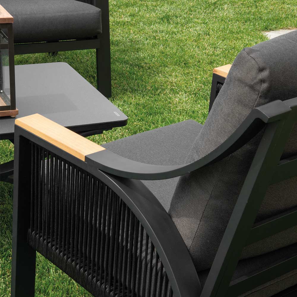 Uitgerust met armleuningen met houten inzetstukken is deze lounge niet alleen esthetisch mooi maar ook functioneel en biedt hij een comfortabele ondersteuning voor momenten van ontspanning buiten.