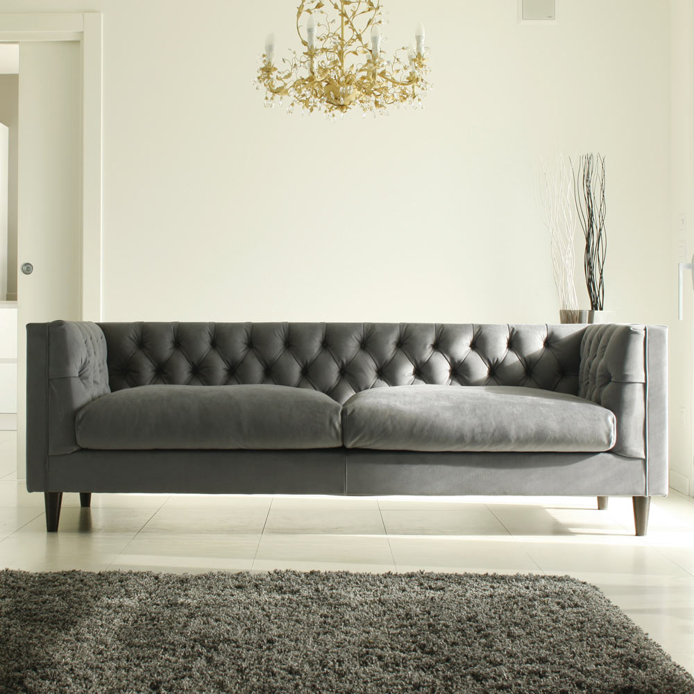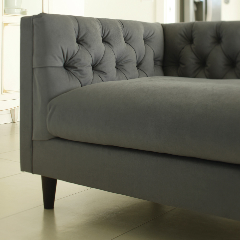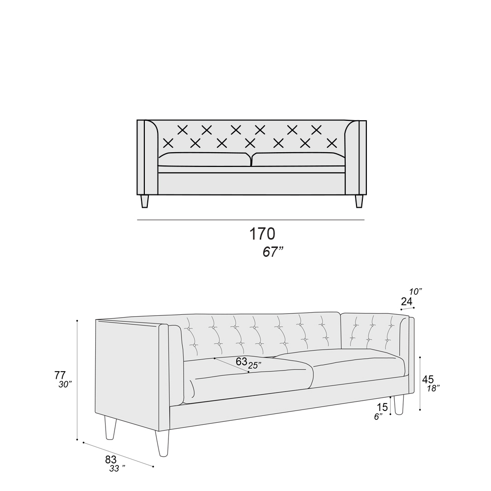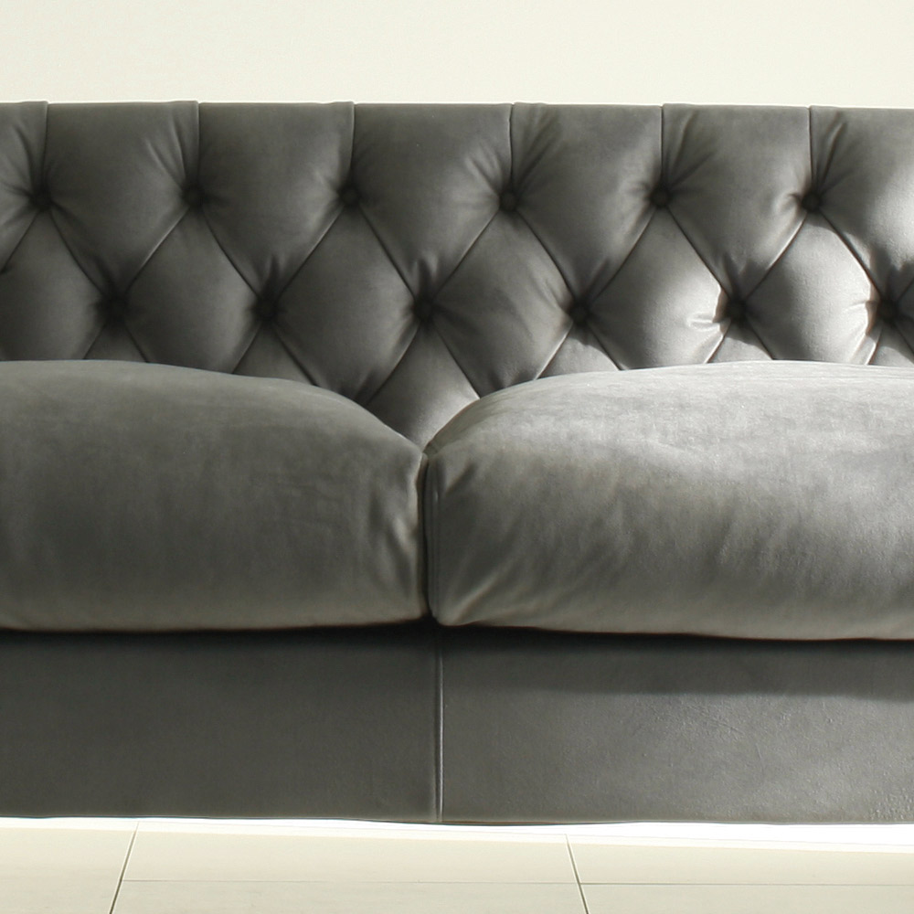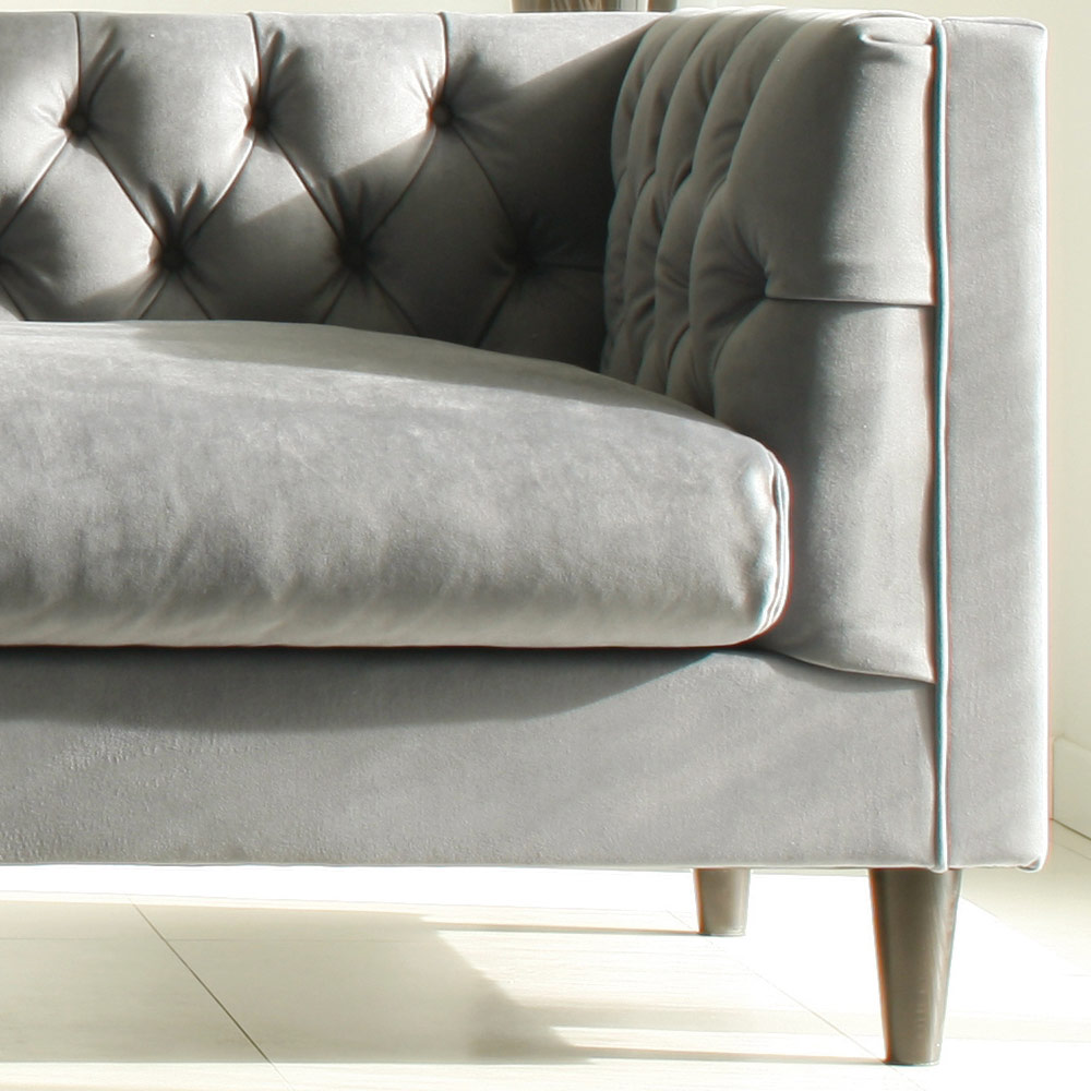 beukenhout. De bank combineert classicisme met een moderne en verfijnde look. De geknoopte tufting en ronde armleuningen roepen elegantie op, terwijl het houten frame en de royale vulling voor comfort zorgen. De kwaliteitsvolle bekleding, verkrijgbaar in verschillende kleuren, verrijkt de look van de bank. De dunne houten poten voegen een eigentijdse toets toe, waardoor de bank geschikt is voor zowel traditionele als moderne interieurs, en geeft het een gezellige en verfijnde sfeer.