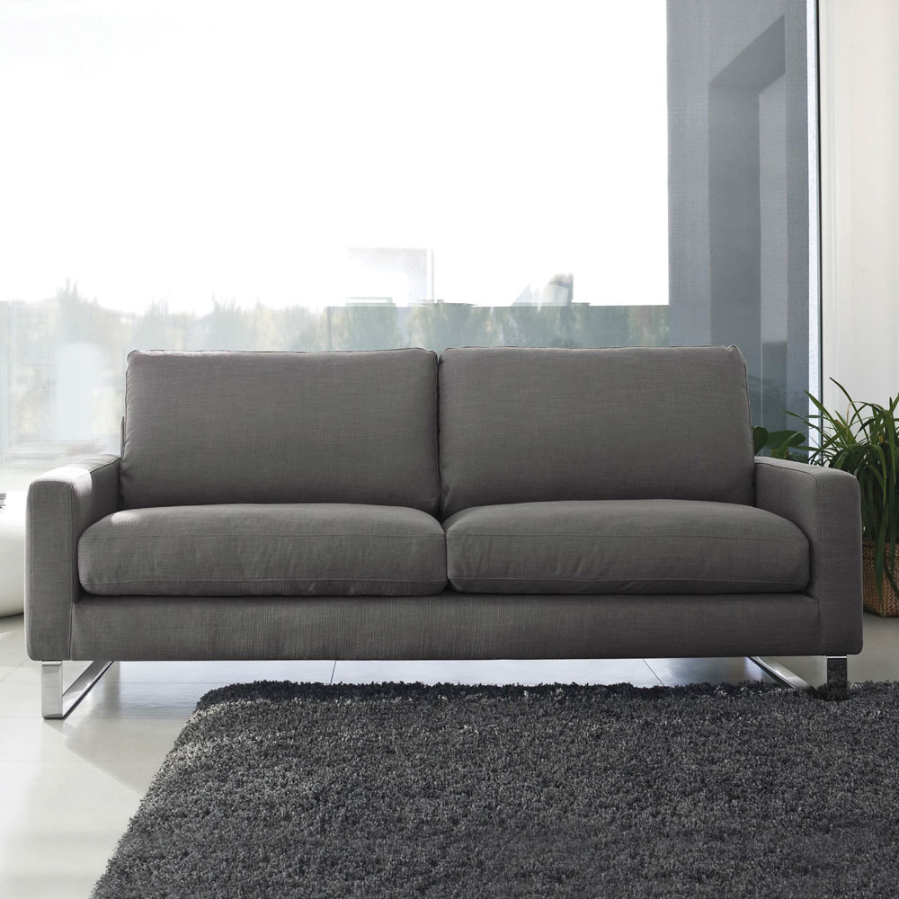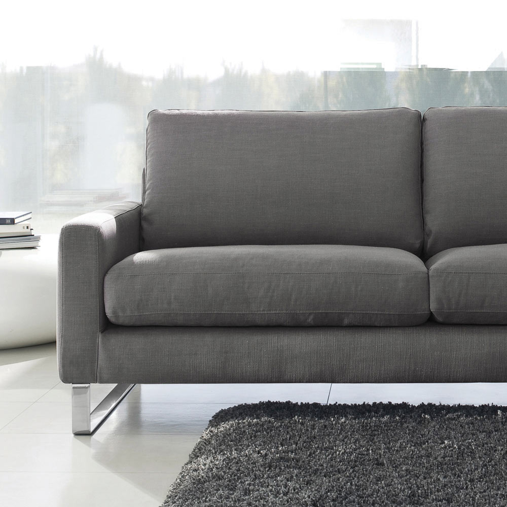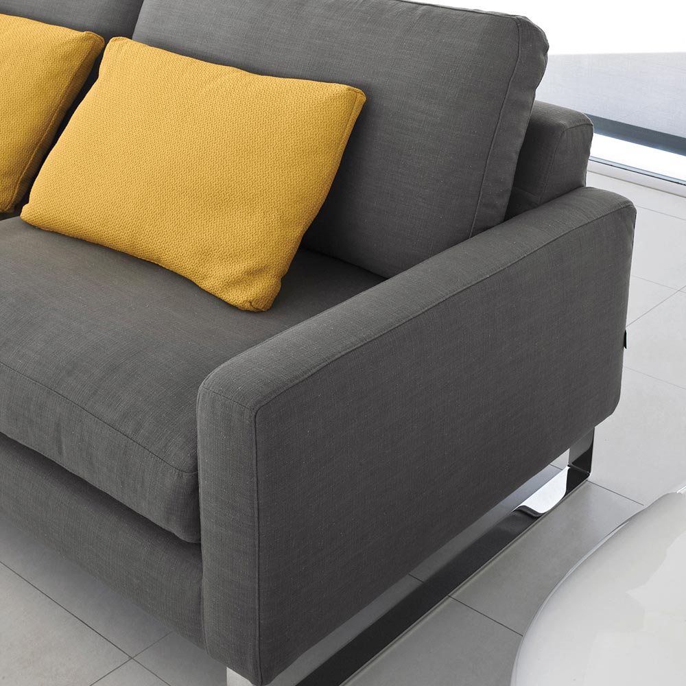 van verchroomde metalen sleden. De bank belichaamt de essentie van minimalisme, getransformeerd in functionaliteit. Met zijn unieke ontwerp biedt hij comfort en elegantie, en belooft hij altijd met de tijd mee te gaan op het gebied van esthetiek en comfort. Het brede scala aan bekleding en kleuren maakt het een veelzijdig meubelstuk voor elke omgeving.