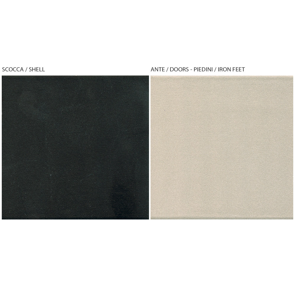 een antracietkleurige schaal, interne planken en deuren van MDF met nikkelafwerking, achterpaneel van multiplex en