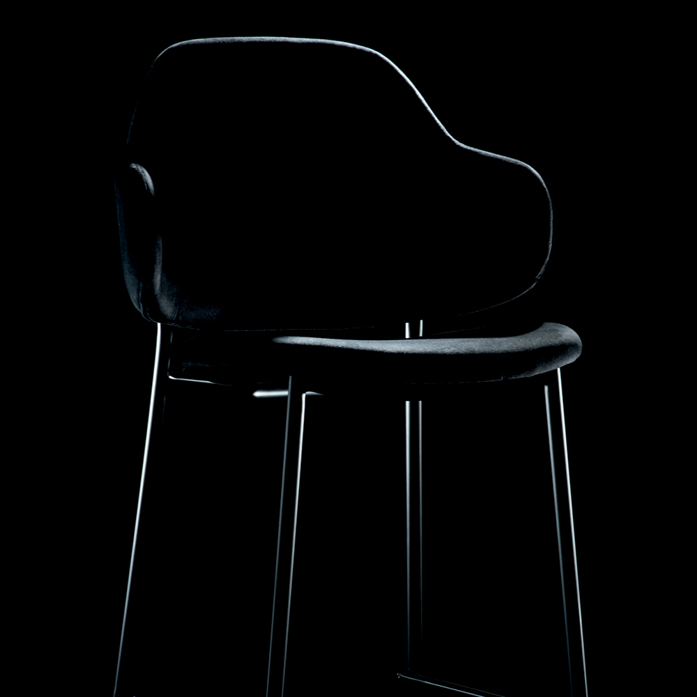 zwart gelakt staal. De zachte en omhullende lijnen van de zitting en rugleuning worden gekenmerkt door geruststellende vormen. Ideaal in de eetkamer, maar ook in de keuken, het zal de omgeving personaliseren met design en functionaliteit. Het belichaamt stijl, kwaliteit, design en elegantie. Dankzij de golvende, eenvoudige en gestileerde lijnen is het geschikt voor elk type meubilair.