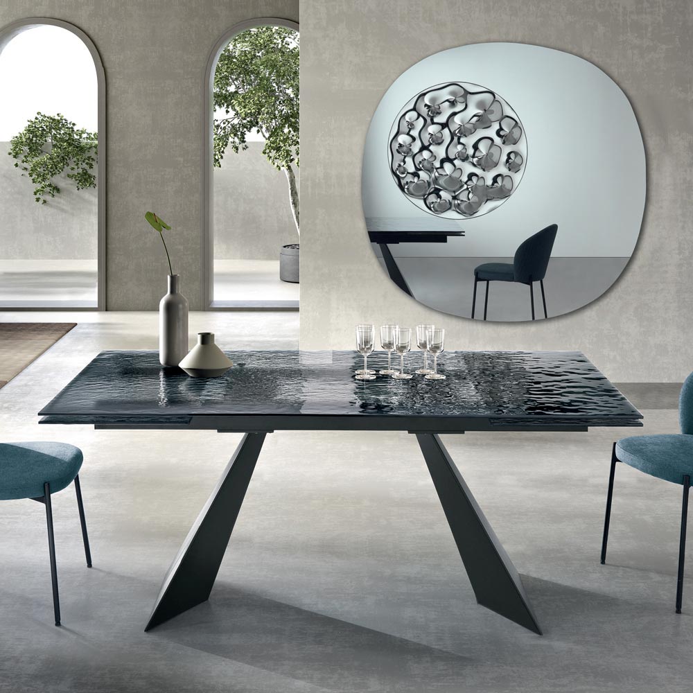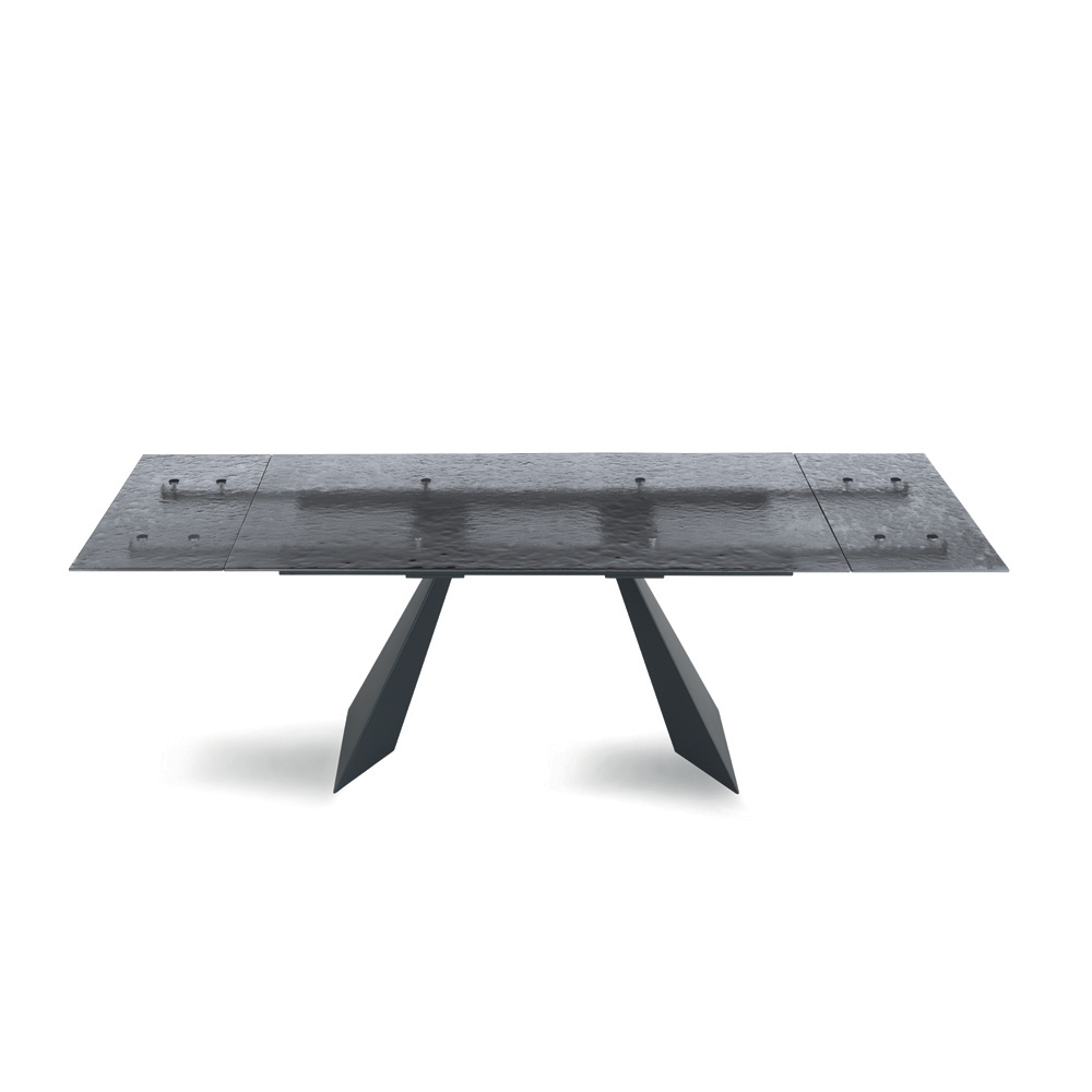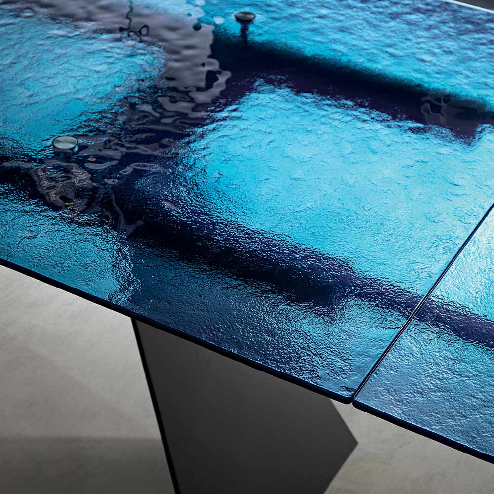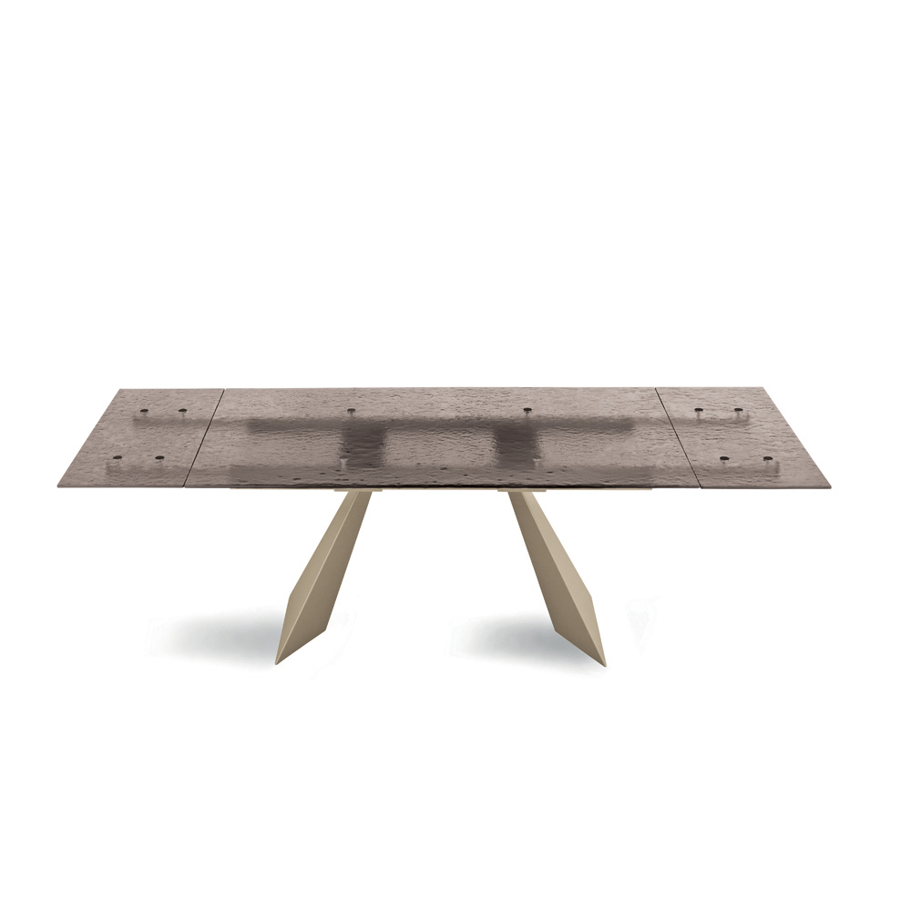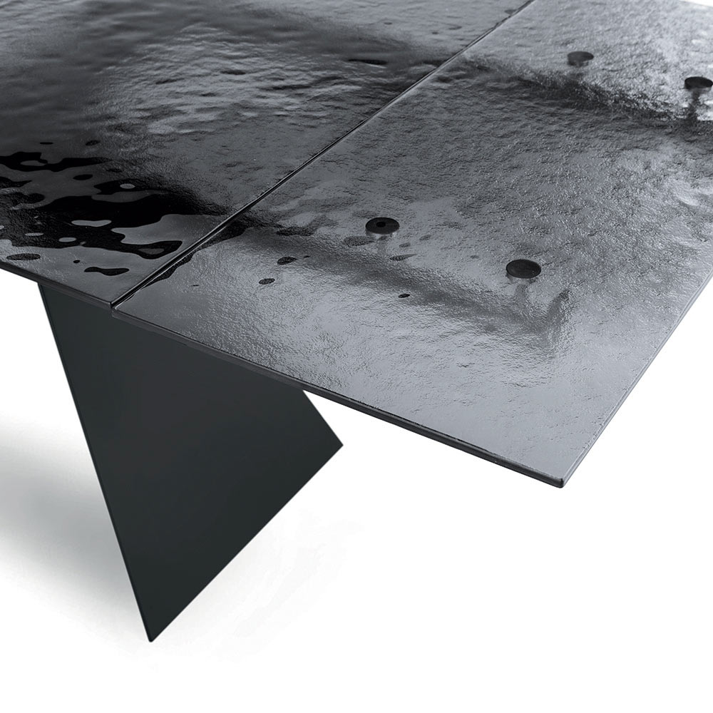 Deze eettafel is een innovatieve interpretatie van modern design, waarbij hoogwaardige materialen worden gecombineerd met een sculpturale vorm die de aandacht trekt. Het tafelblad, gemaakt van gehamerd glas , is een waar kunstwerk: elk detail van het oppervlak reflecteert het licht op een unieke manier, waardoor een spel van reflecties en transparantie ontstaat dat diepte en visuele aantrekkingskracht aan de ruimte toevoegt.