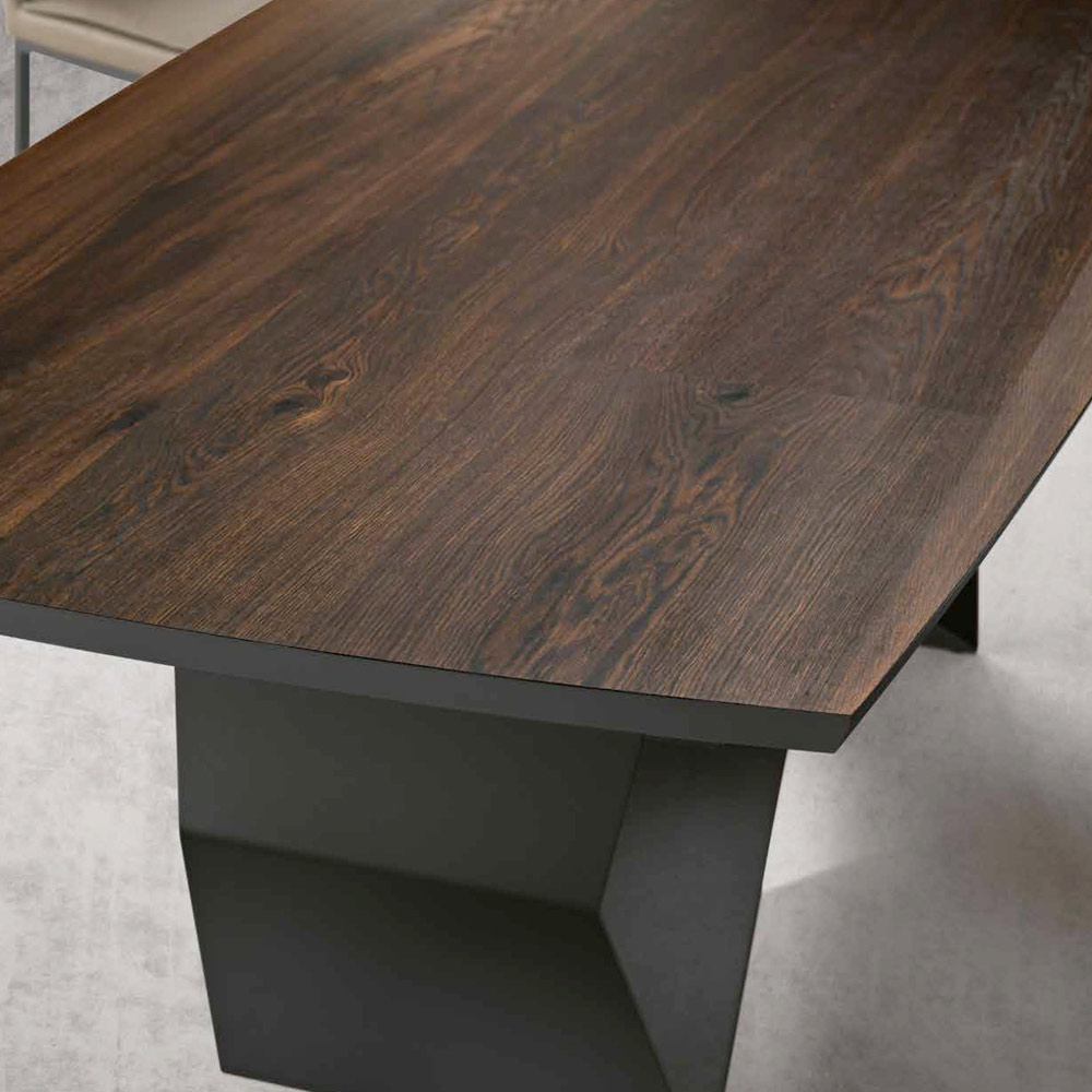 Deze eettafel is perfect voor elke moderne woonruimte. Het tafelblad, gemaakt van fijn eikenfineer, voegt niet alleen een organische warmte toe aan de omgeving, maar staat ook bekend om zijn sterkte en duurzaamheid, waardoor het ideaal is voor dagelijks gebruik.
