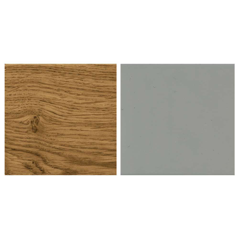 tonvormig blad van massief geknoopt eiken meubelplaat met landelijk geknoopte eiken afwerking en een leisteenkleurig onderblad. De originele basis van gebogen eiken multiplex bestaat uit twee gebogen en kronkelige elementen, die het belangrijke blad ondersteunen, waardoor een perfecte balans tussen vormen ontstaat.
