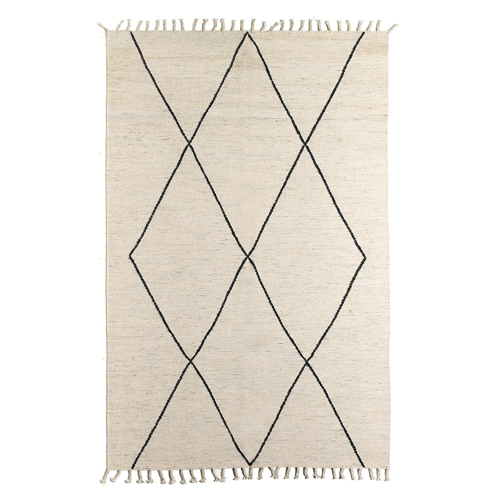 geometrische patroon in zwarttinten dat moderniteit geeft samen met de franjes die de twee korte zijden van het tapijt bedekken. De gebruikte materialen en technieken maken het mogelijk om een eindproduct van hoge kwaliteit te verkrijgen dat de aandacht op zichzelf kan vestigen, waardoor elke omgeving uniek is.
