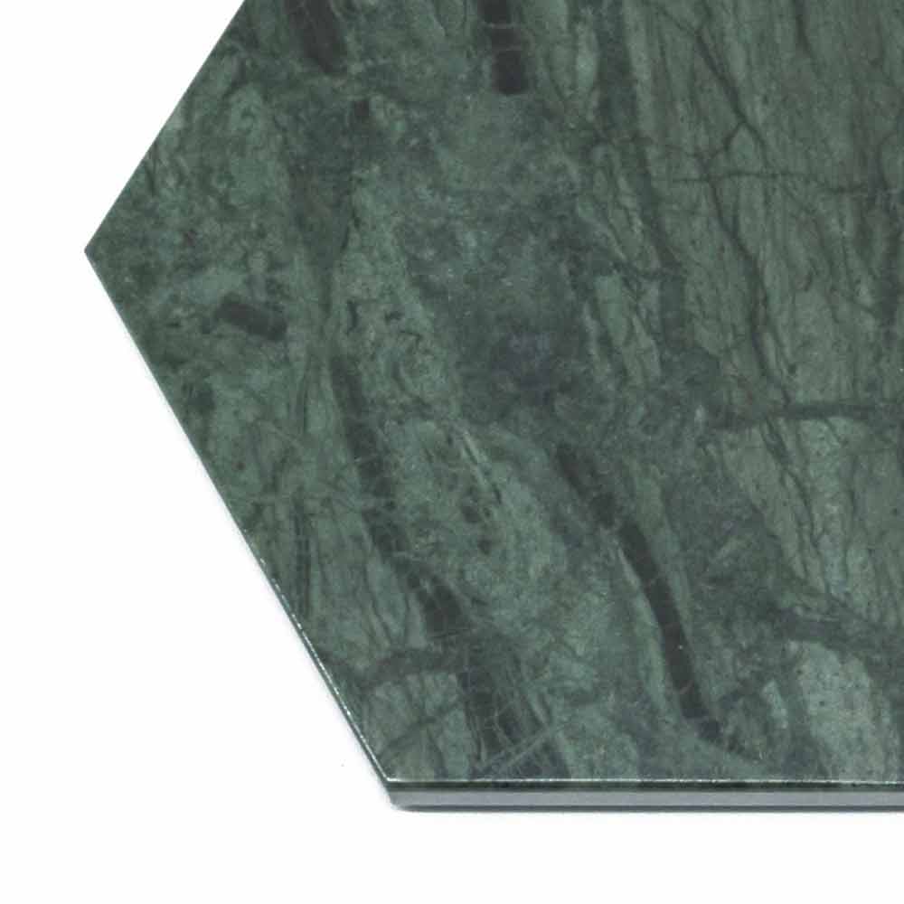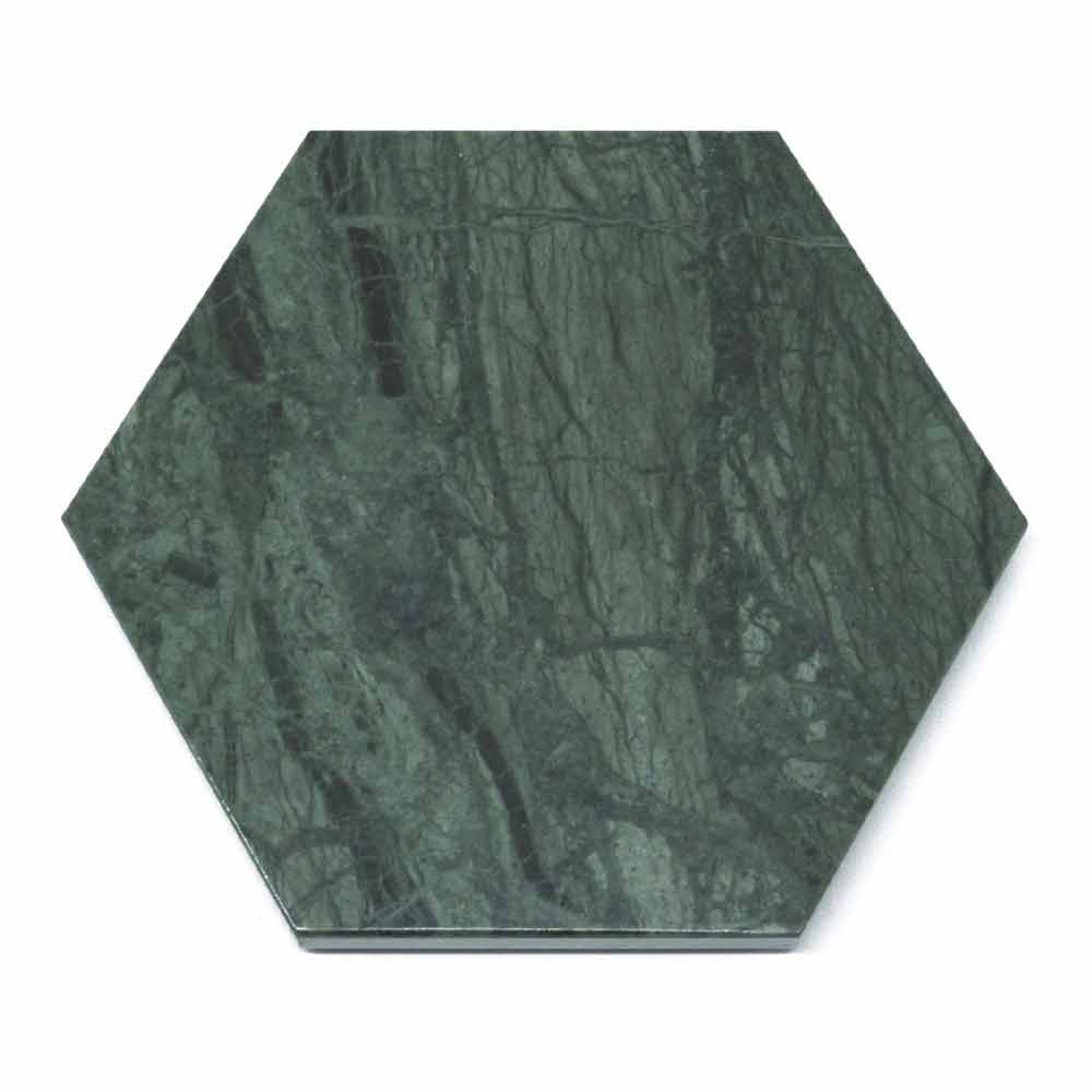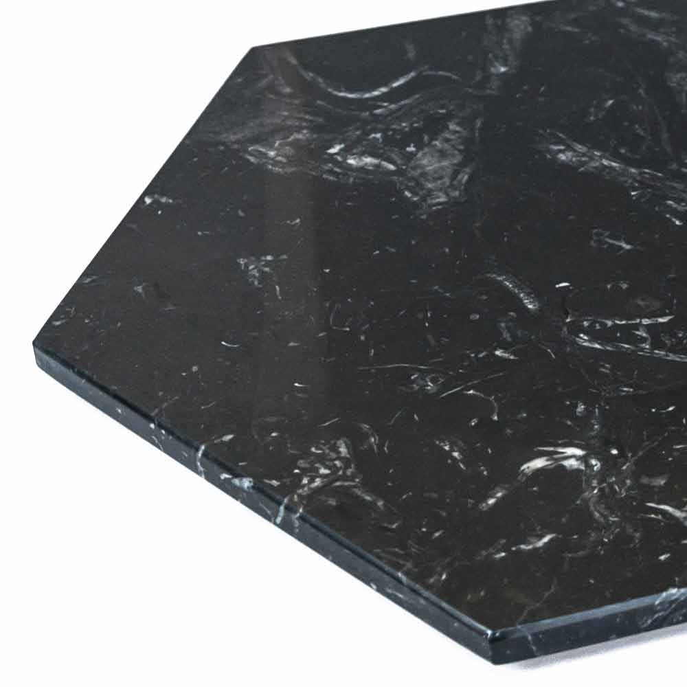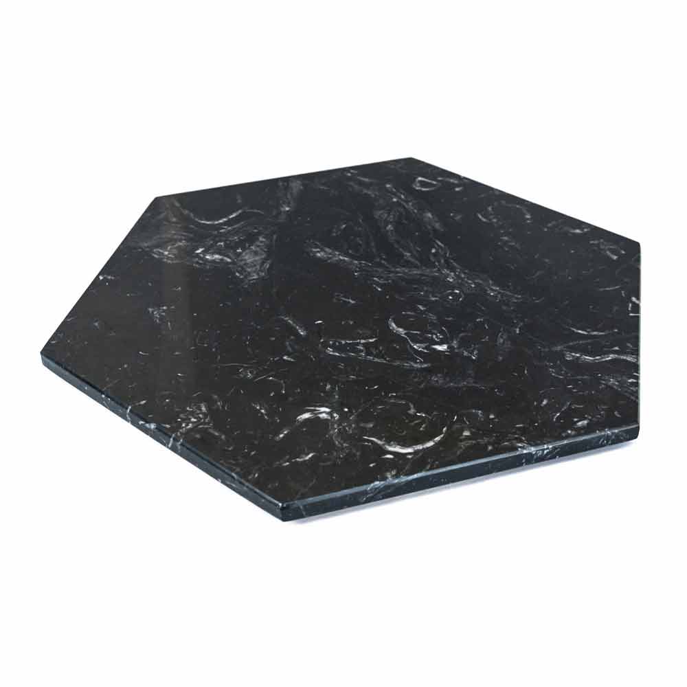 Zeshoekig design serveerbord in zwart Marquinia of Guatemala groen marmer met kurk, 2 stuks made in Italy.